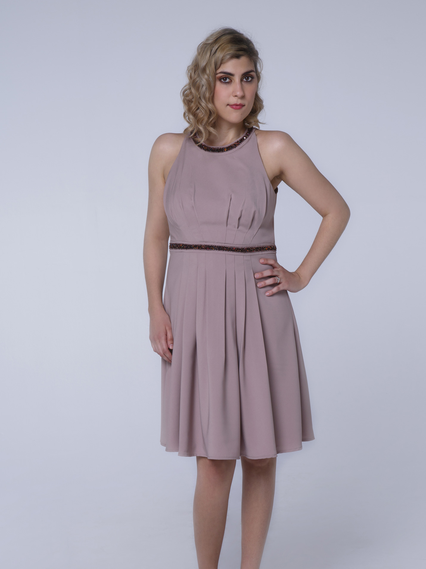 Jeux de plis pour cette robe de cocktail piquée d’un galon perlé a la taille et au col.