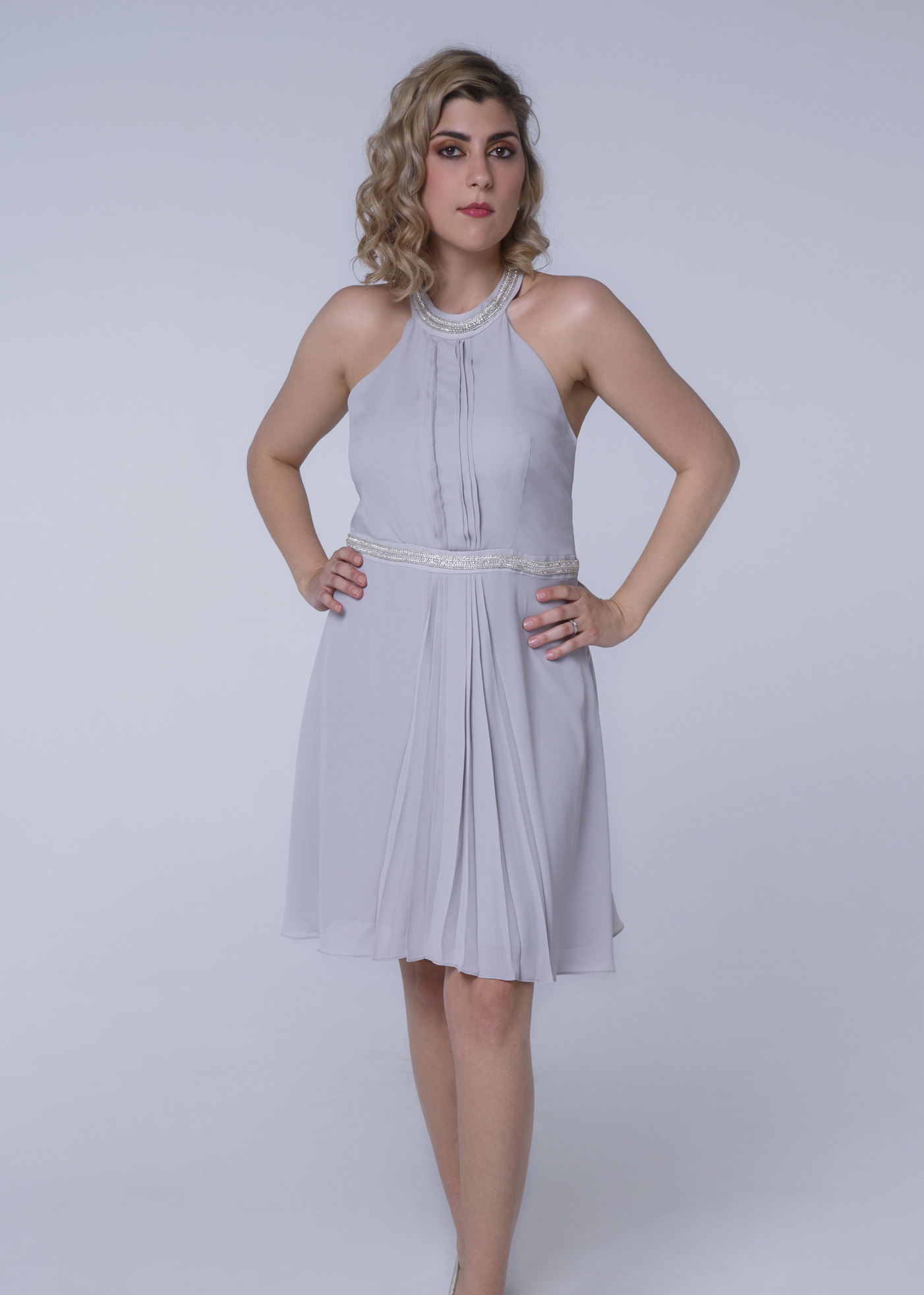 Petits plis façon “chemise” pour le haut et s’ouvrant sur la jupe. Touche de féminité avec le col et la ceinture perlés.