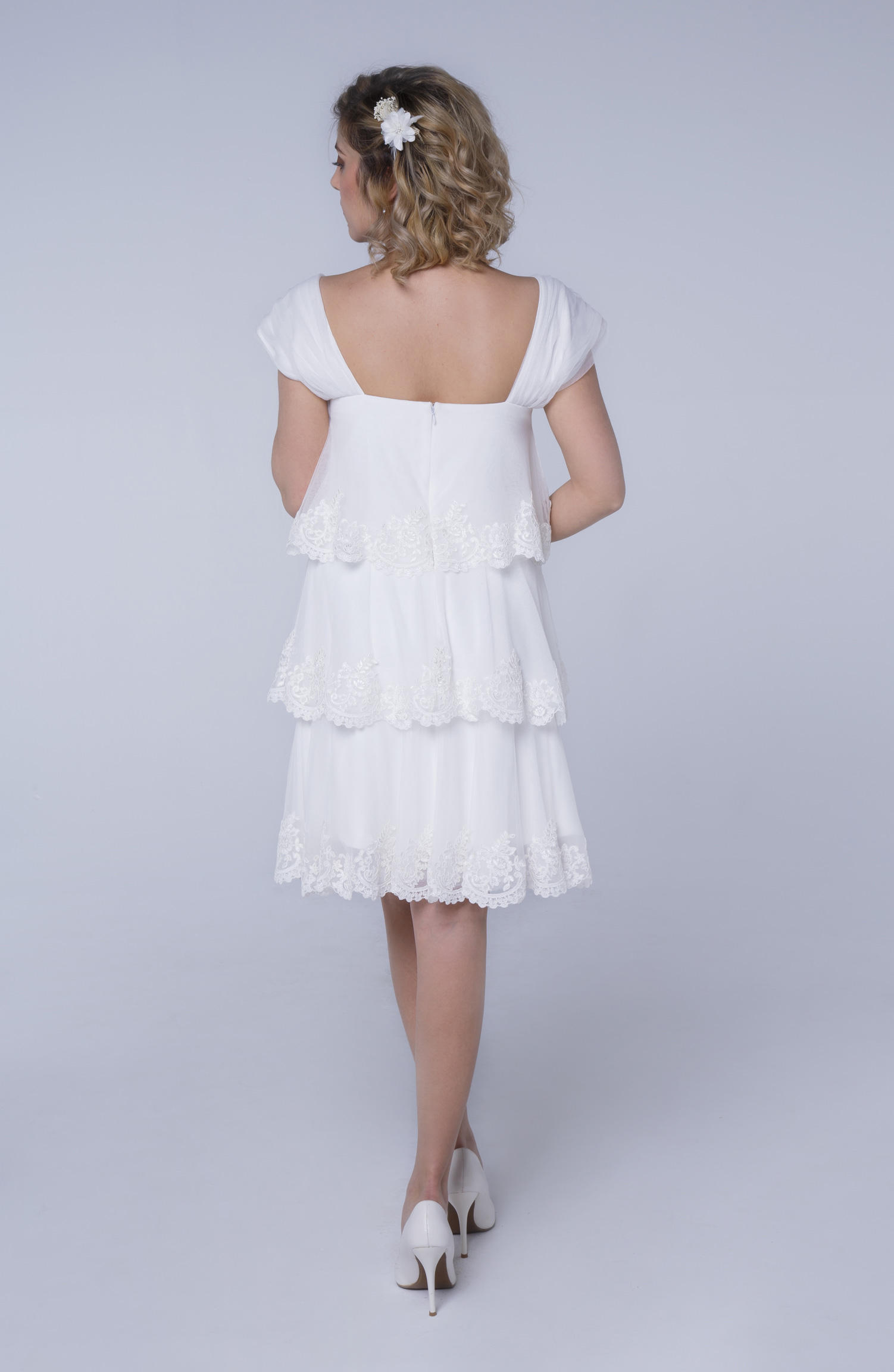 Robe de mariée courte à l’esprit bohème. Cette mini robe ultra légère est idéale pour celles qui aiment montrer leurs gambettes !