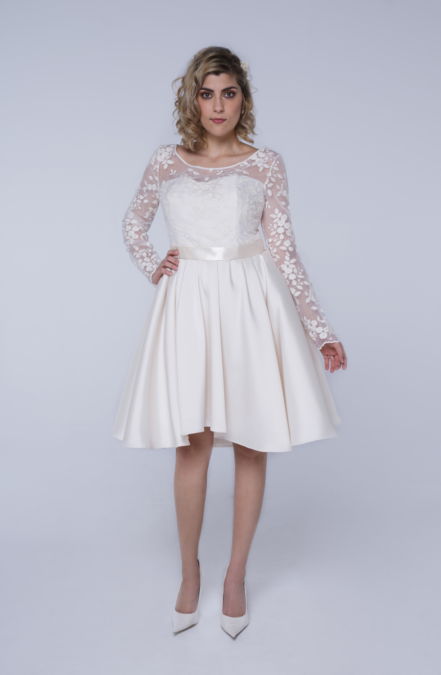 Robe de mariée courte esprit baby doll. Volume asymétrique en bas et bustier recouvert de tulle brodé.