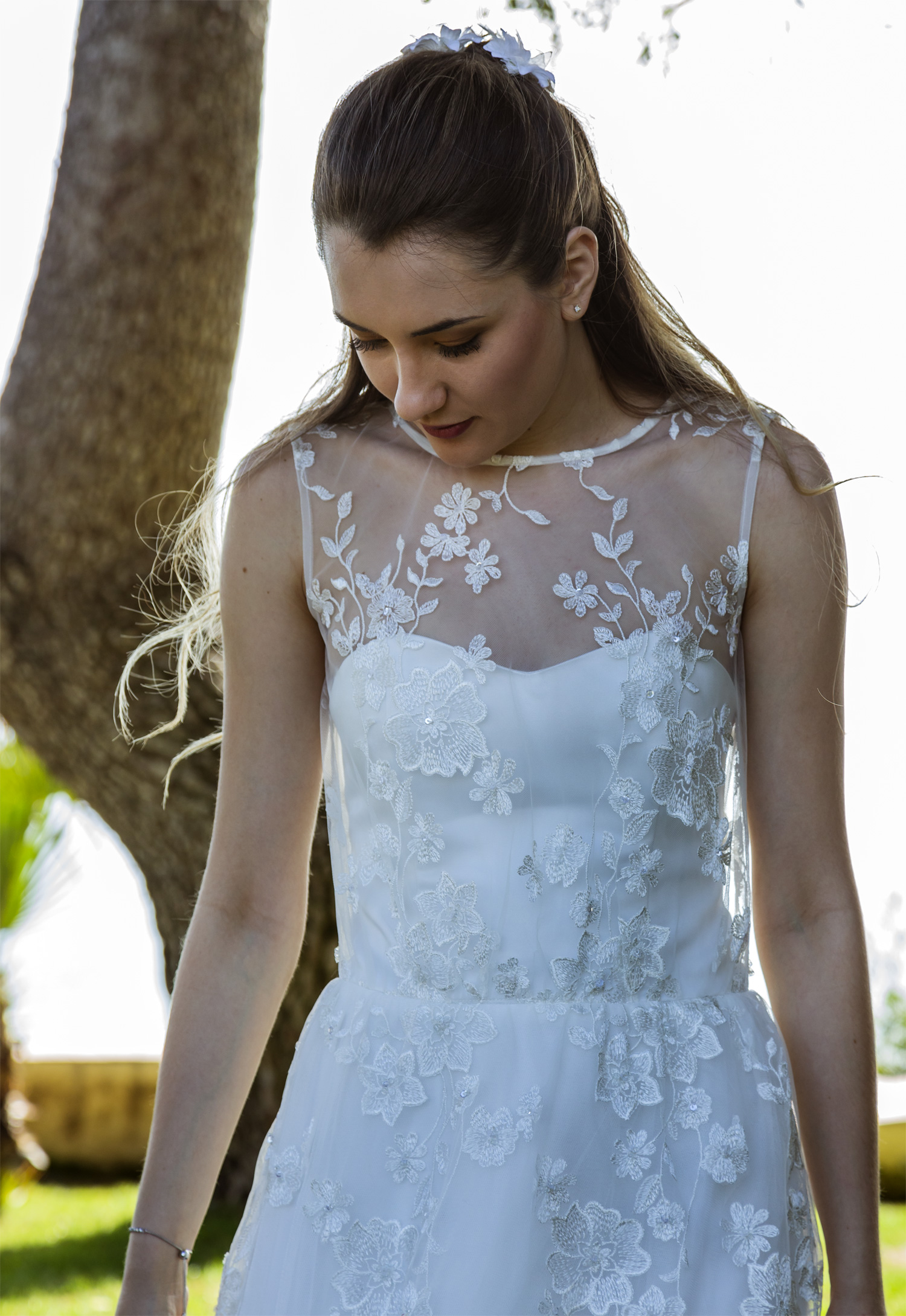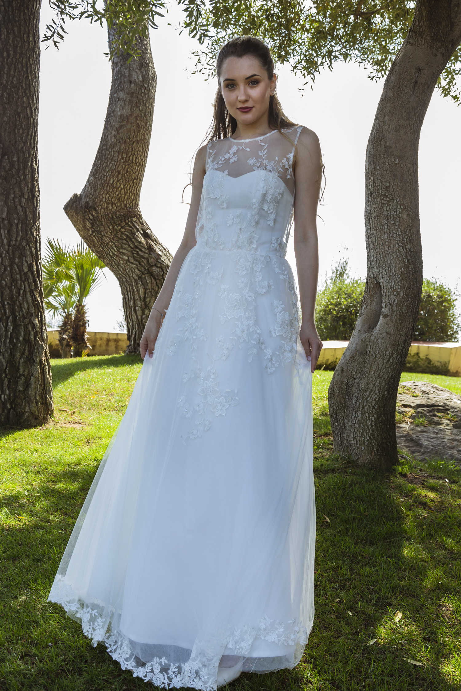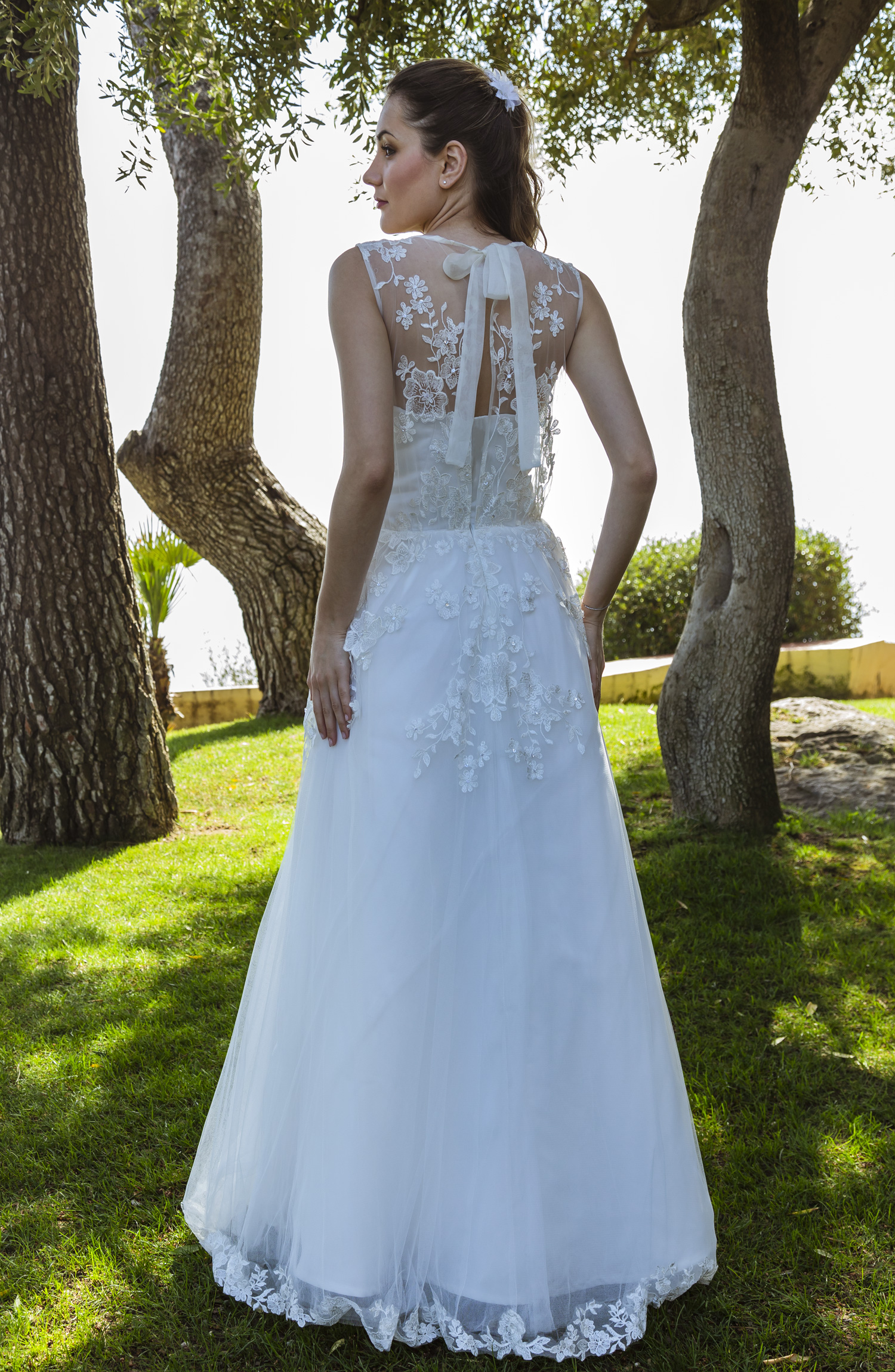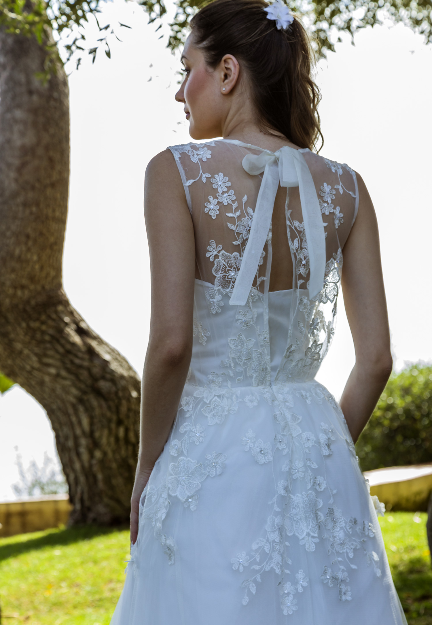 Robe de mariée Bohème avec un tulle brodé et piqué de quelques perles par dessus une base avec bustier. Idéal également pour celles qui ne veulent pas trop marquer leur taille.