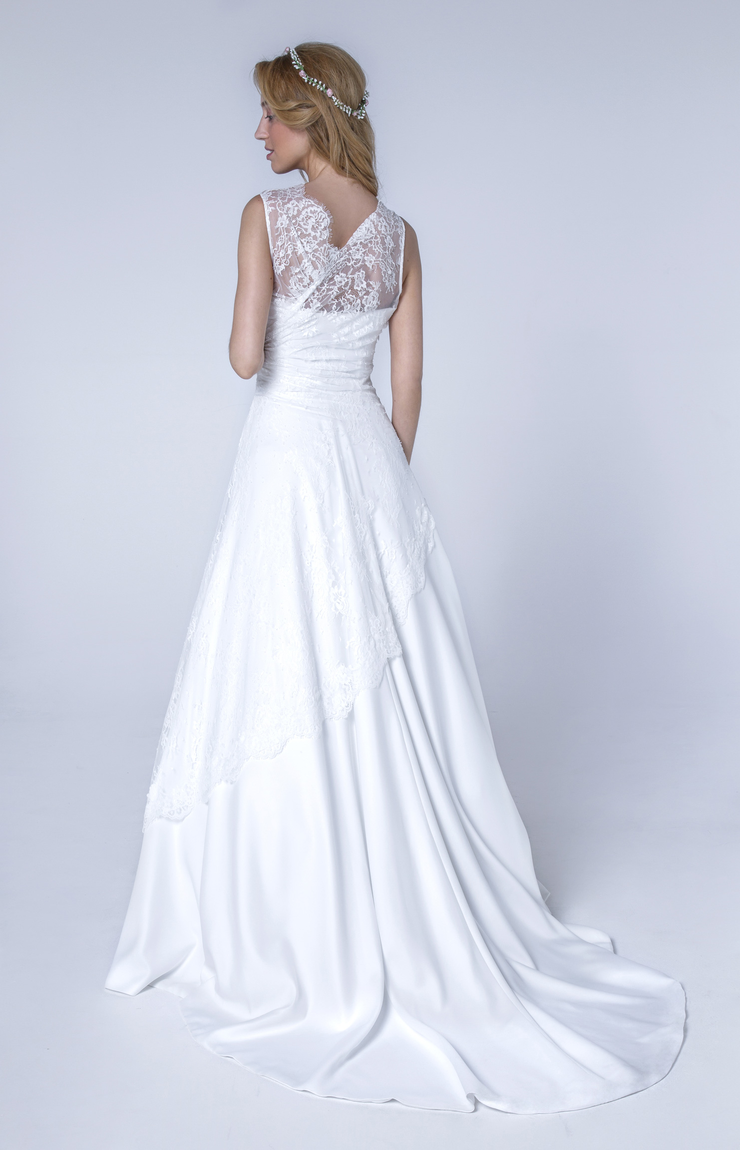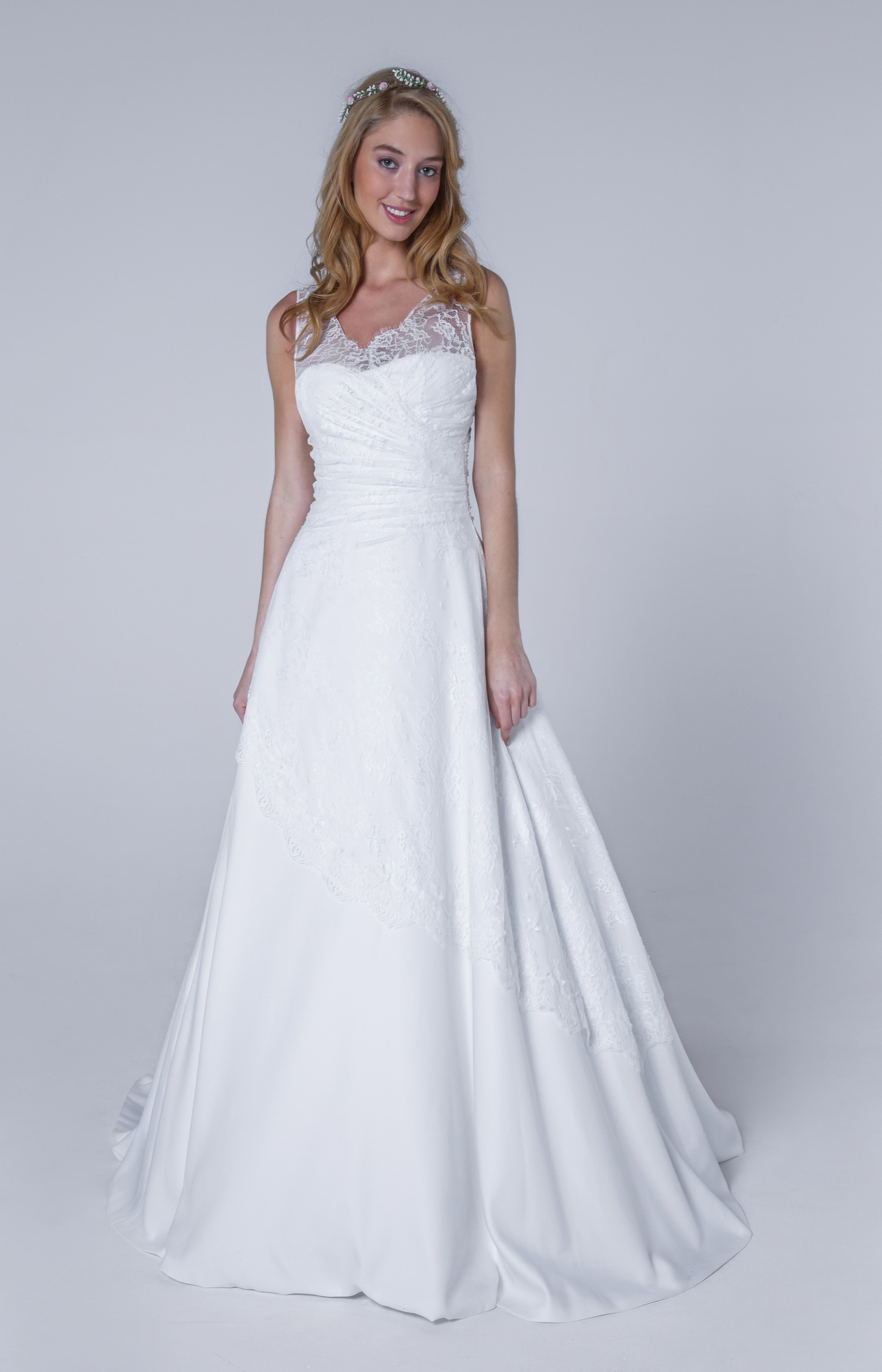 Robe base bustier satin recouverte d’une dentelle fine drapée. La dentelle ajoute une touche française.