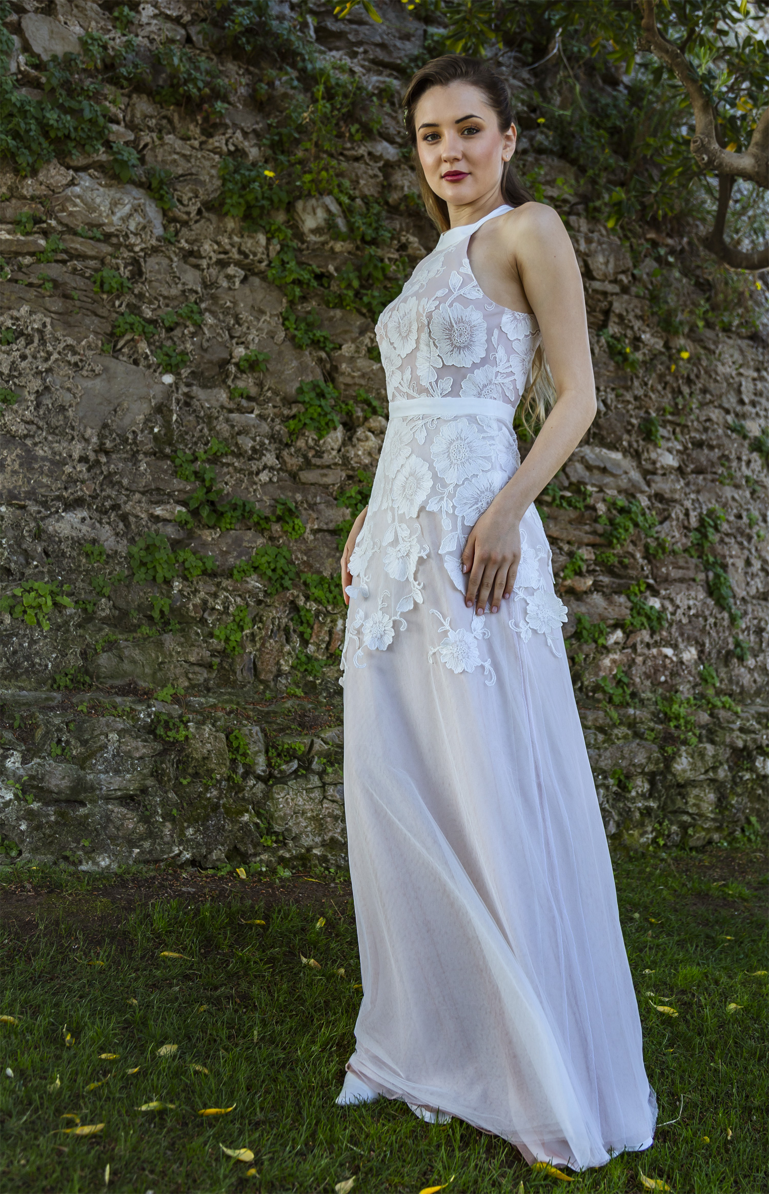 Simplicité et romantisme pour cette robe avec une base rose pâle, parsemée de fleurs brodées sur un tulle fin et doux.