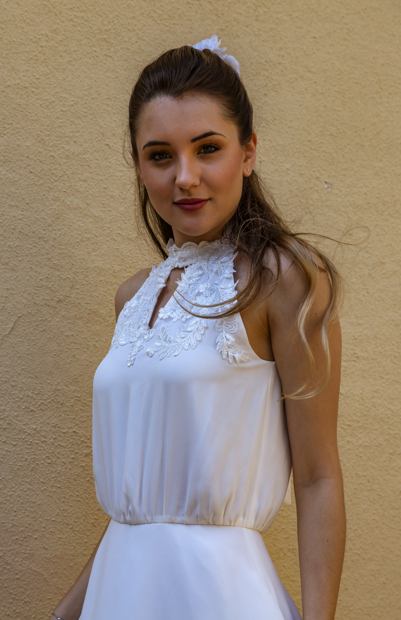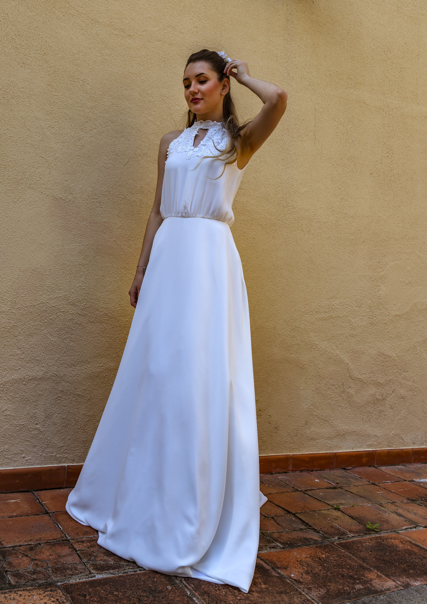 Cette robe de mariée symbolise l'élégance à la française : Joli tombé, taille basse, simplicité, décolleté ponctué d'une application très discrète. Une robe légère comme une plume.