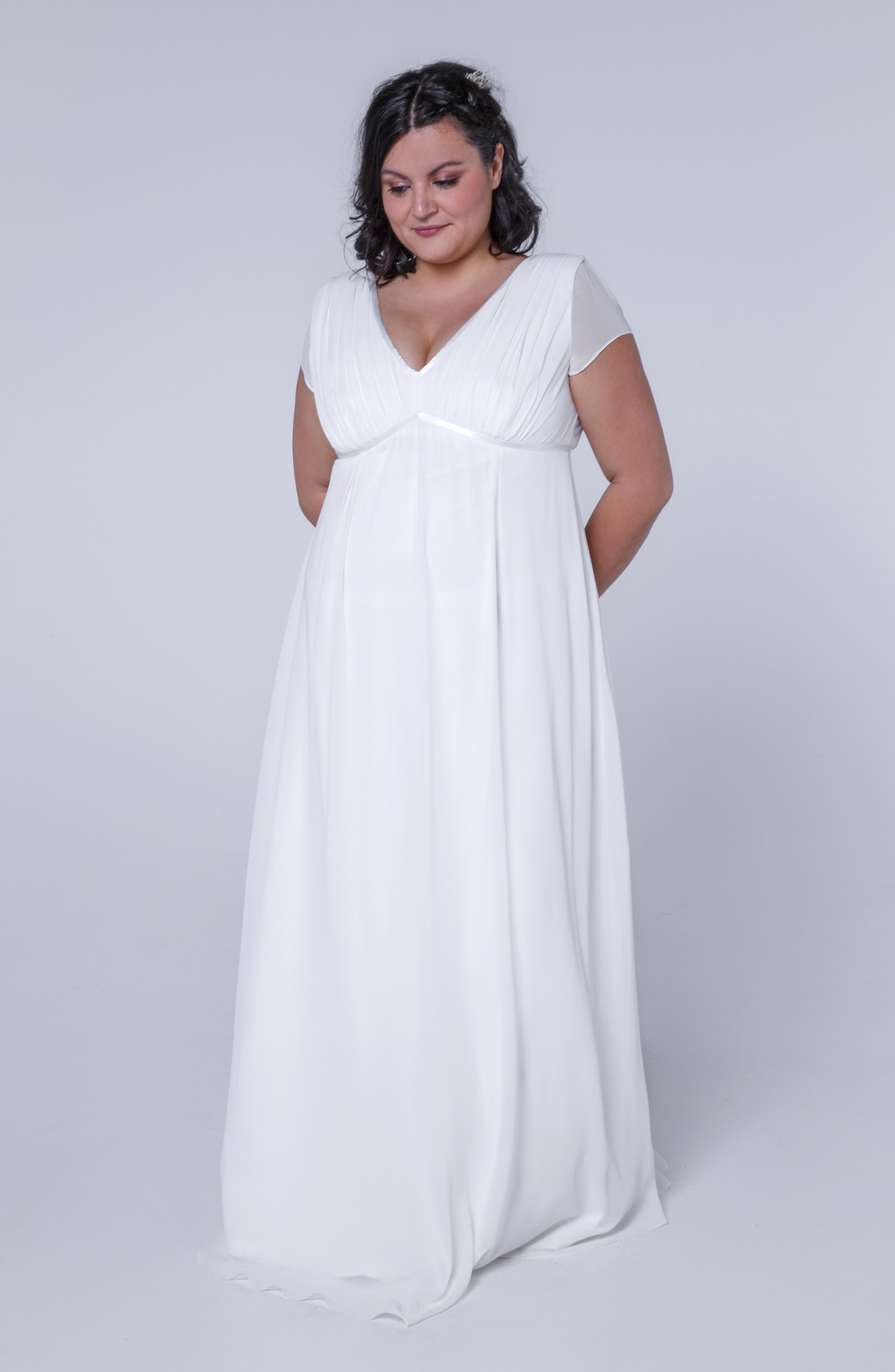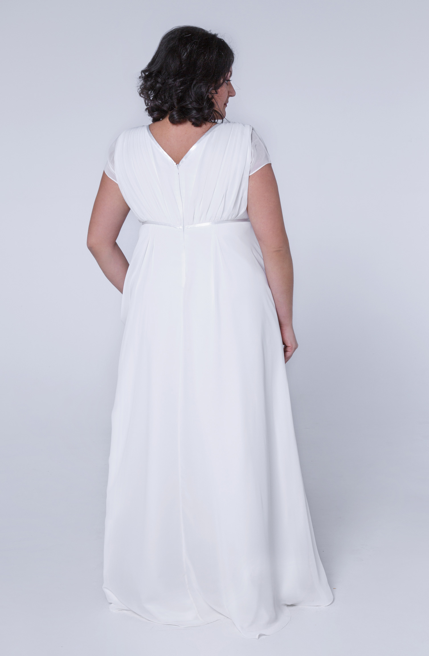 Robe de mariée de style bohème. Simple et légère en mousseline, les formes sont soulignées d’un fin galon satin.