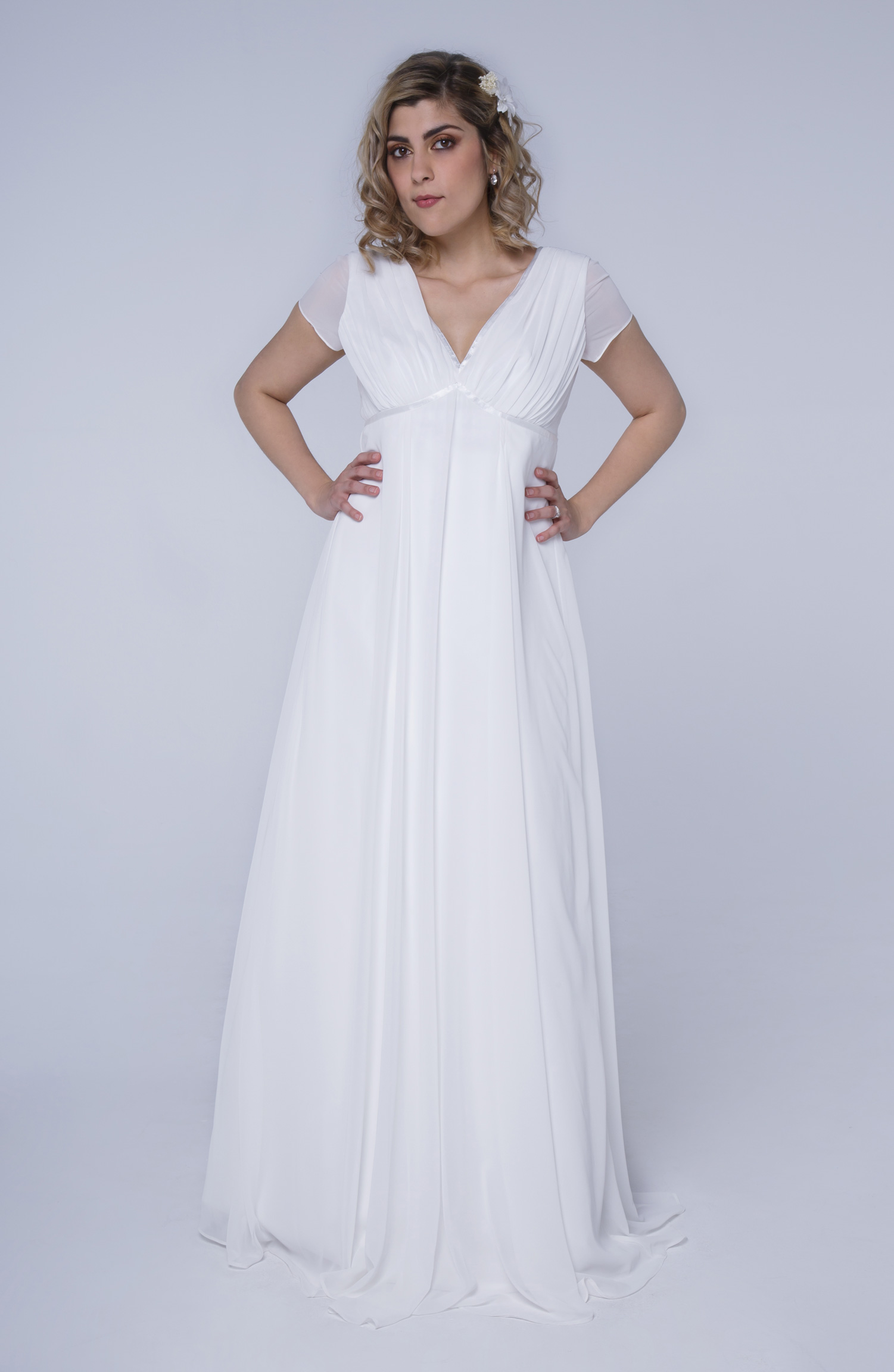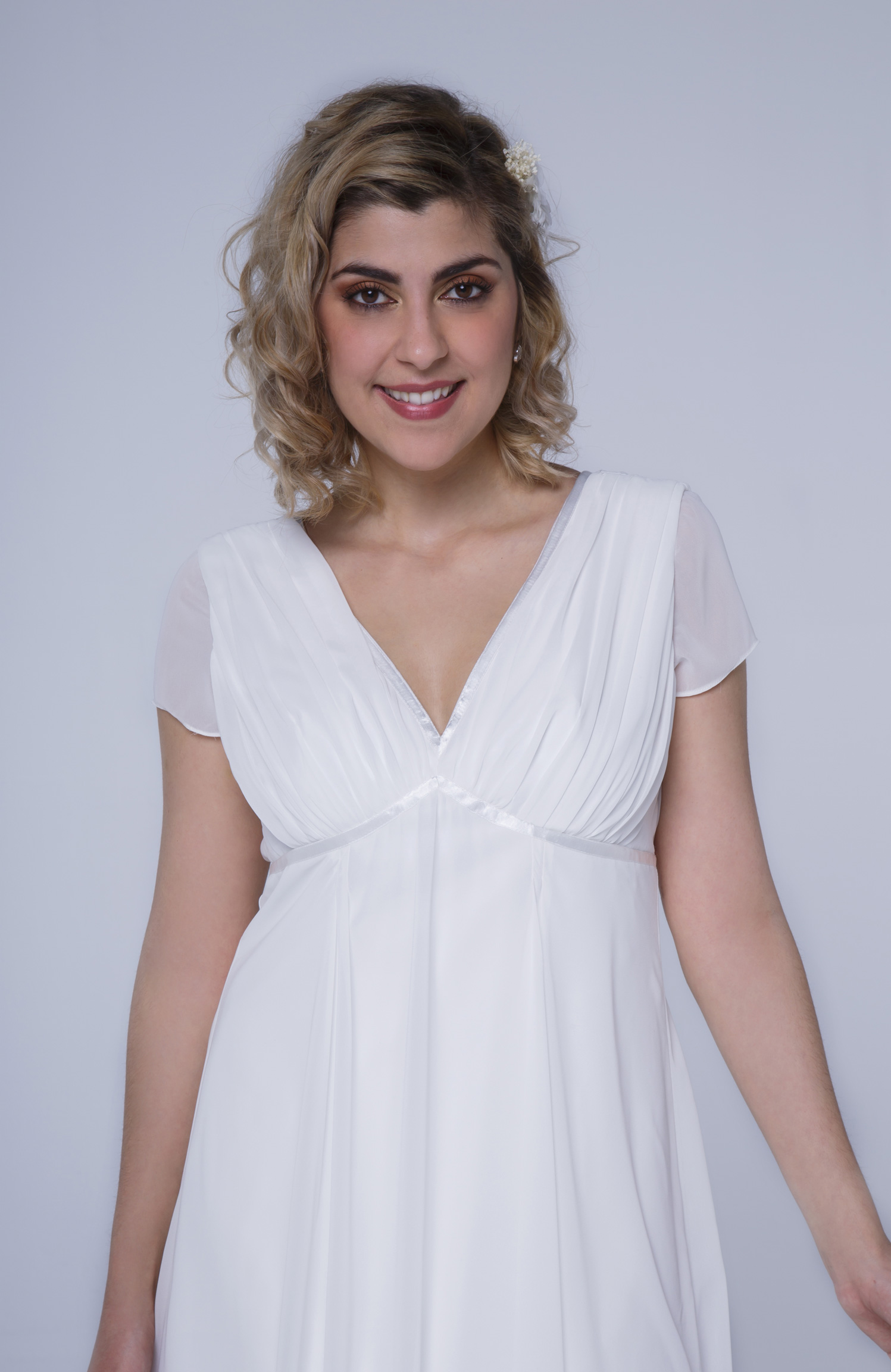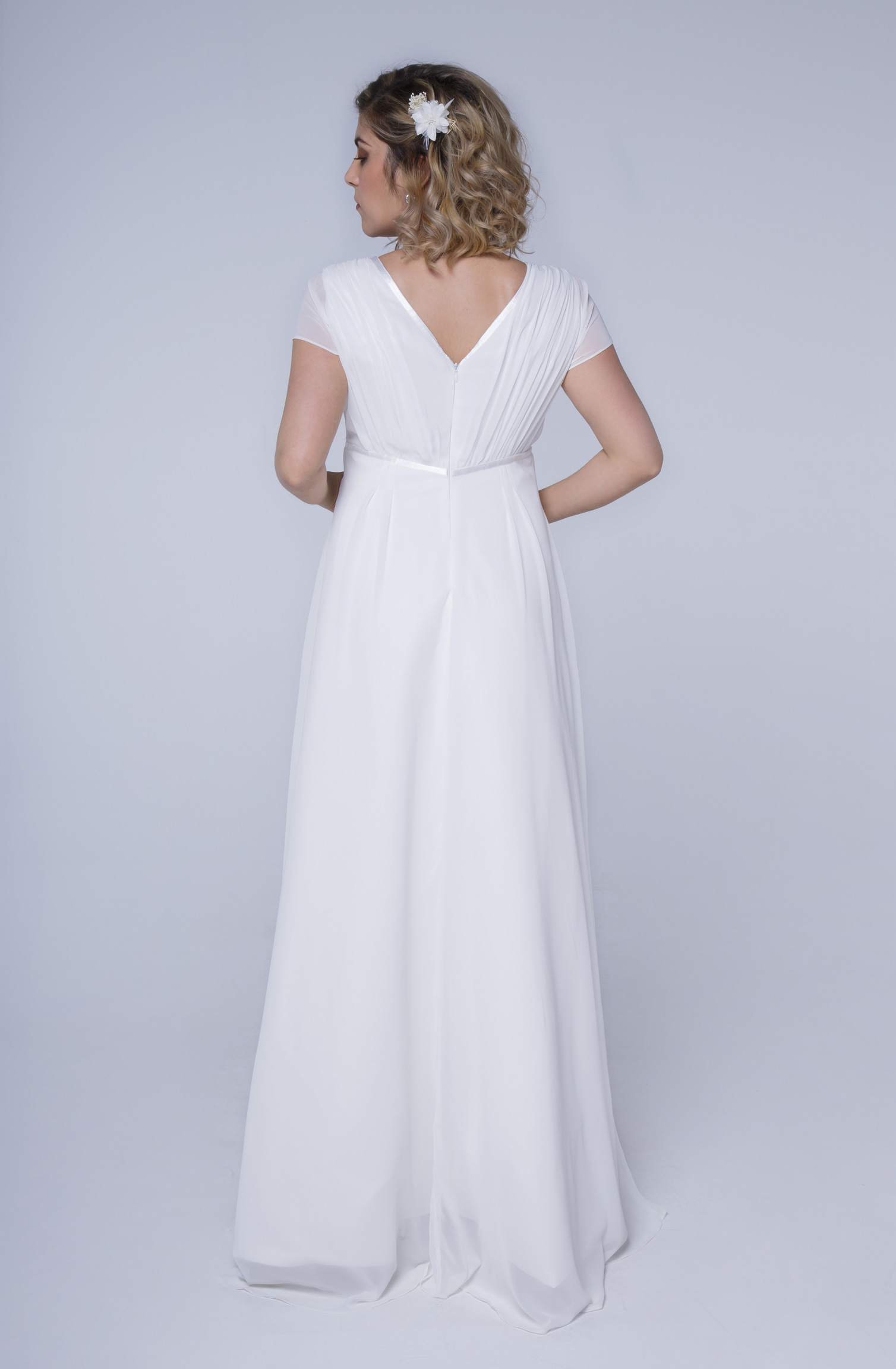 Robe de mariée de style bohème. Simple et légère en mousseline, les formes sont soulignées d’un fin galon satin.