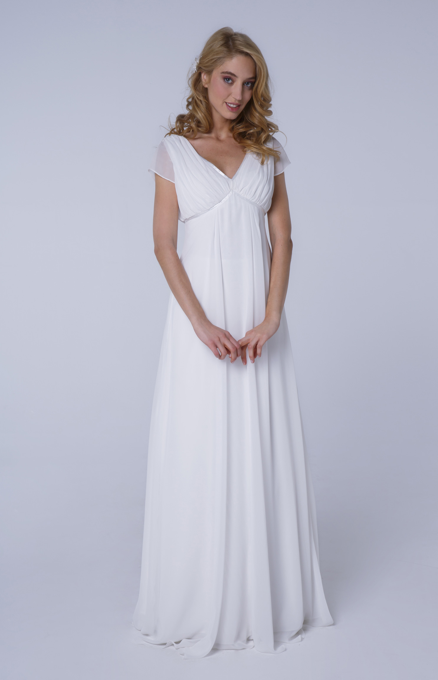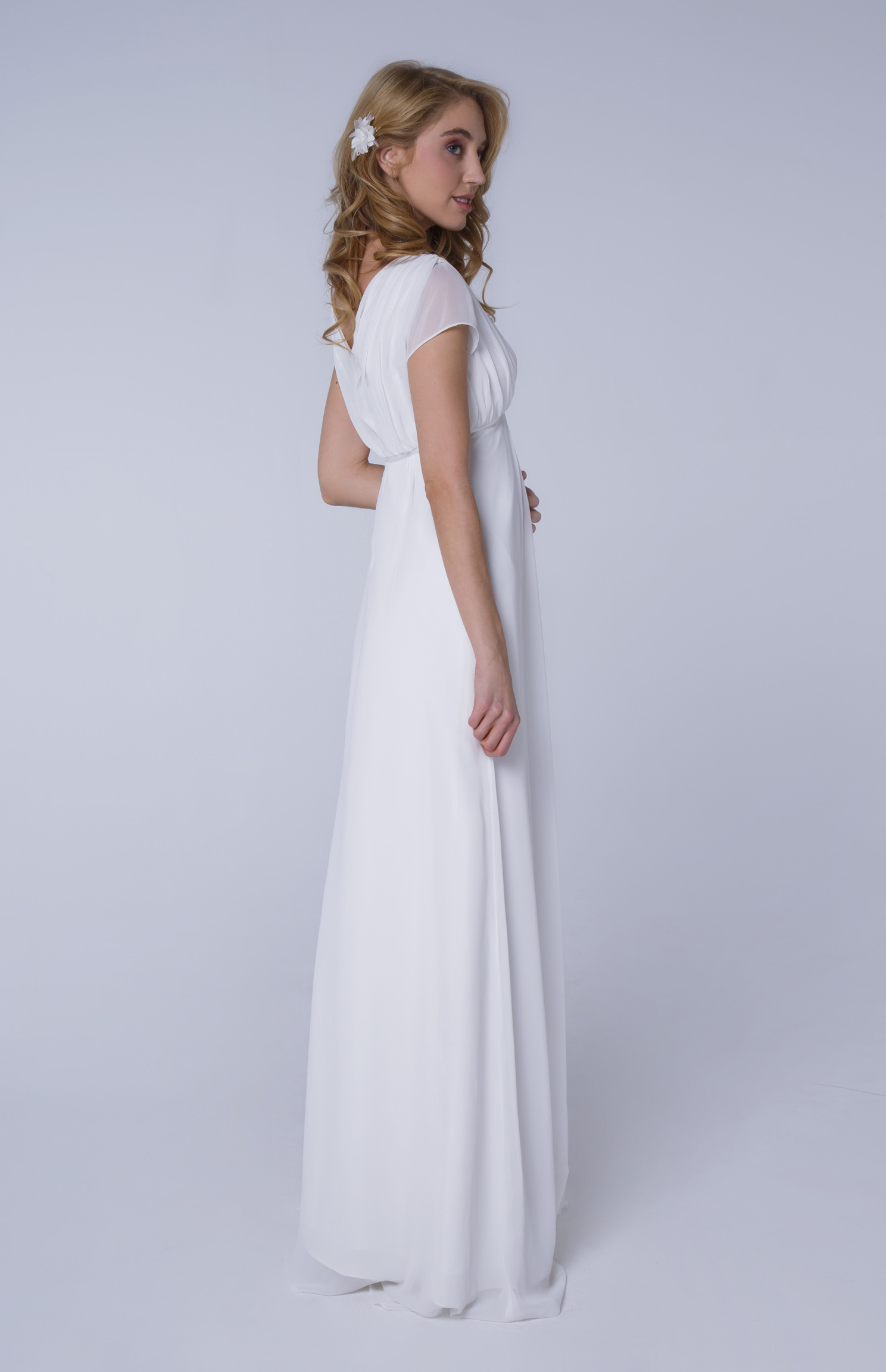 Robe de mariée de style bohème. Simple et légère en mousseline, les formes sont soulignées d’un fin galon satin.