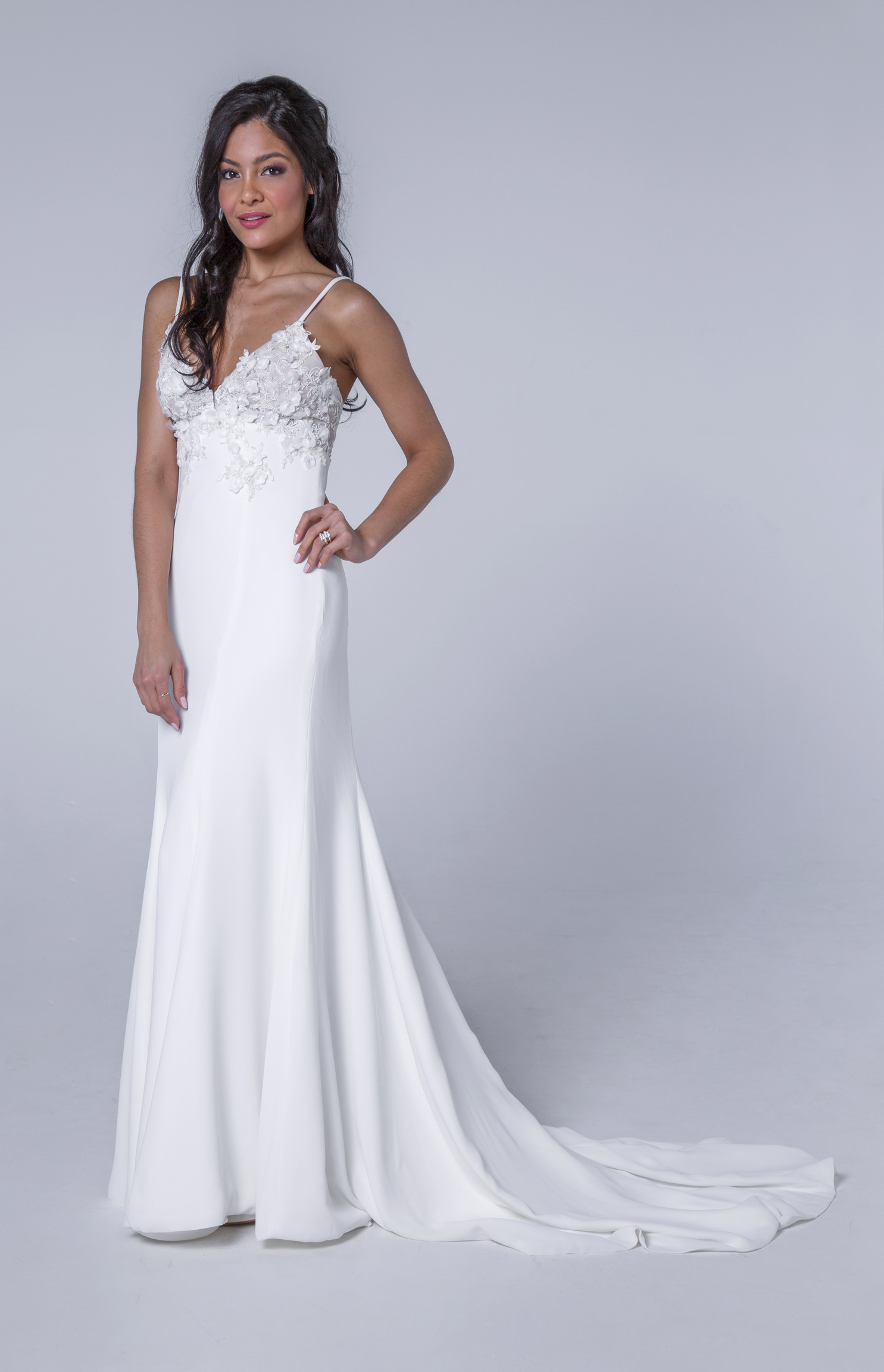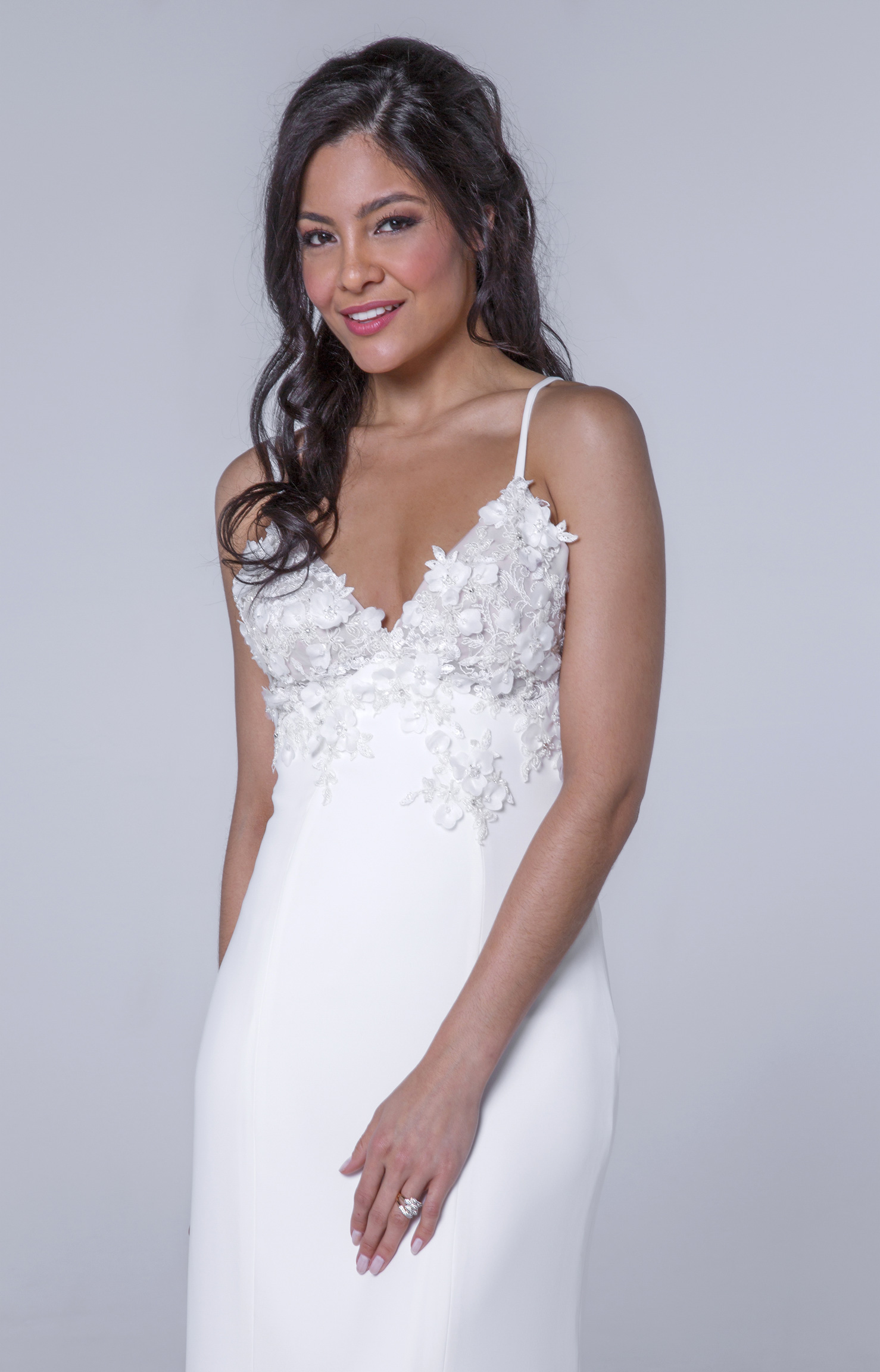 Robe en crêpe fluide à la forme “fourreau” et piquée de petites fleurs et perles. Pratique en soirée pour celles qui veulent danser jusqu’au bout de la nuit.