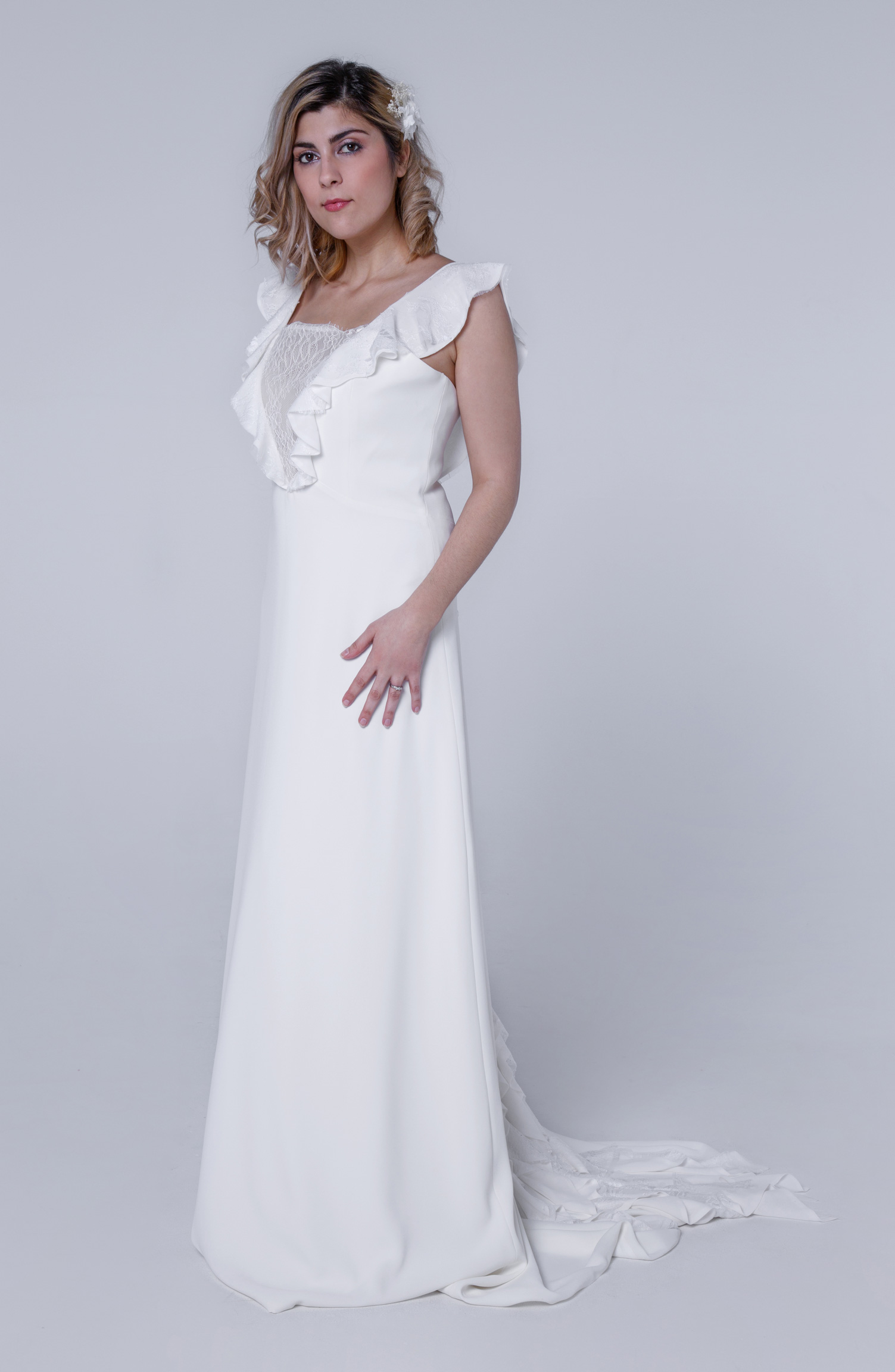 Robe en crêpe. Le décolleté joue la transparence avec sa dentelle fine. Au dos, chute de volants. Une robe simple et sophistiquée a la fois.