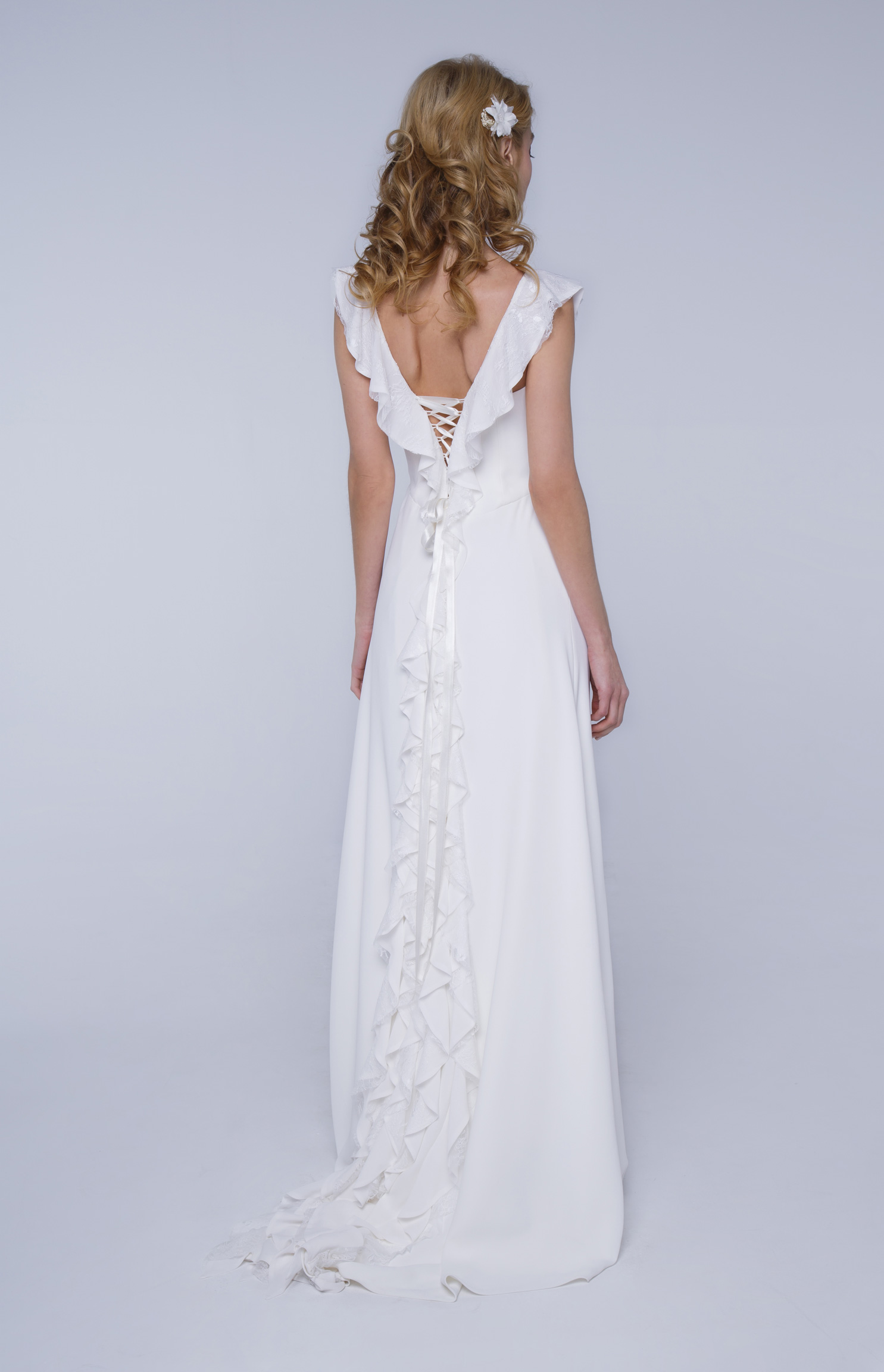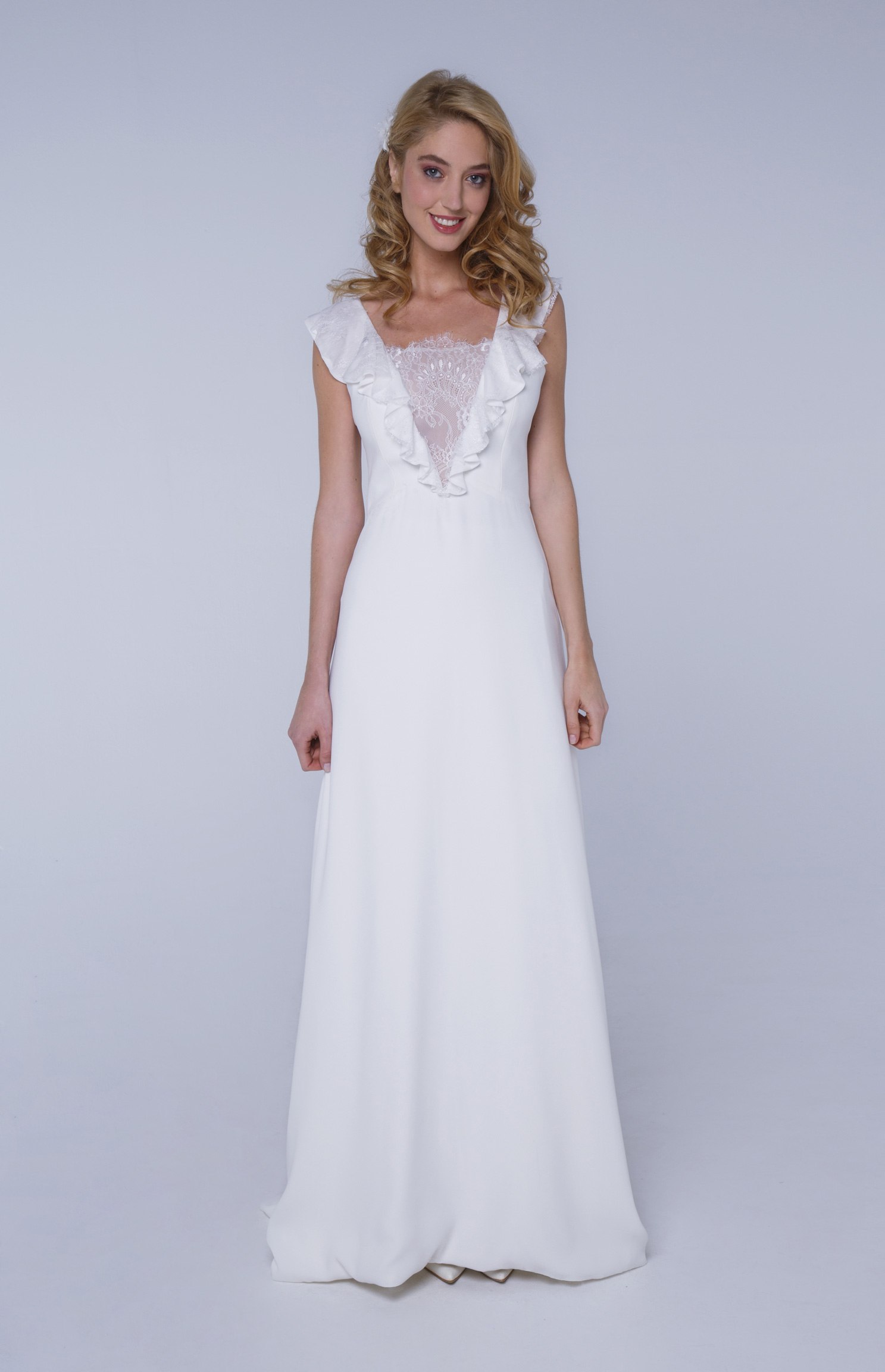 Robe en crêpe. Le décolleté joue la transparence avec sa dentelle fine. Au dos, chute de volants. Une robe simple et sophistiquée a la fois.