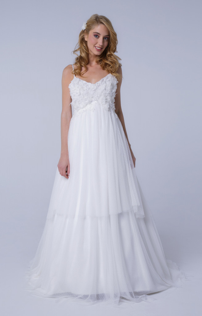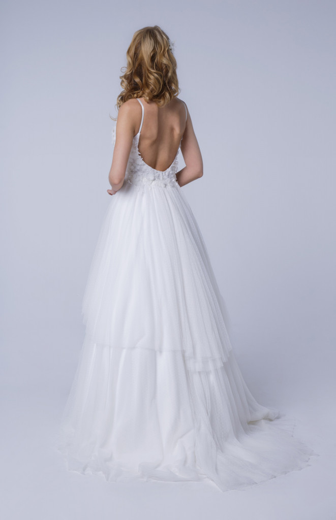 Douce et légère comme un nuage. Le tulle vaporeux donne un volume à la jupe et un toucher soyeux. En haut, les applications de fleurs et de perles discrètes ajoutent une touche de brillance.