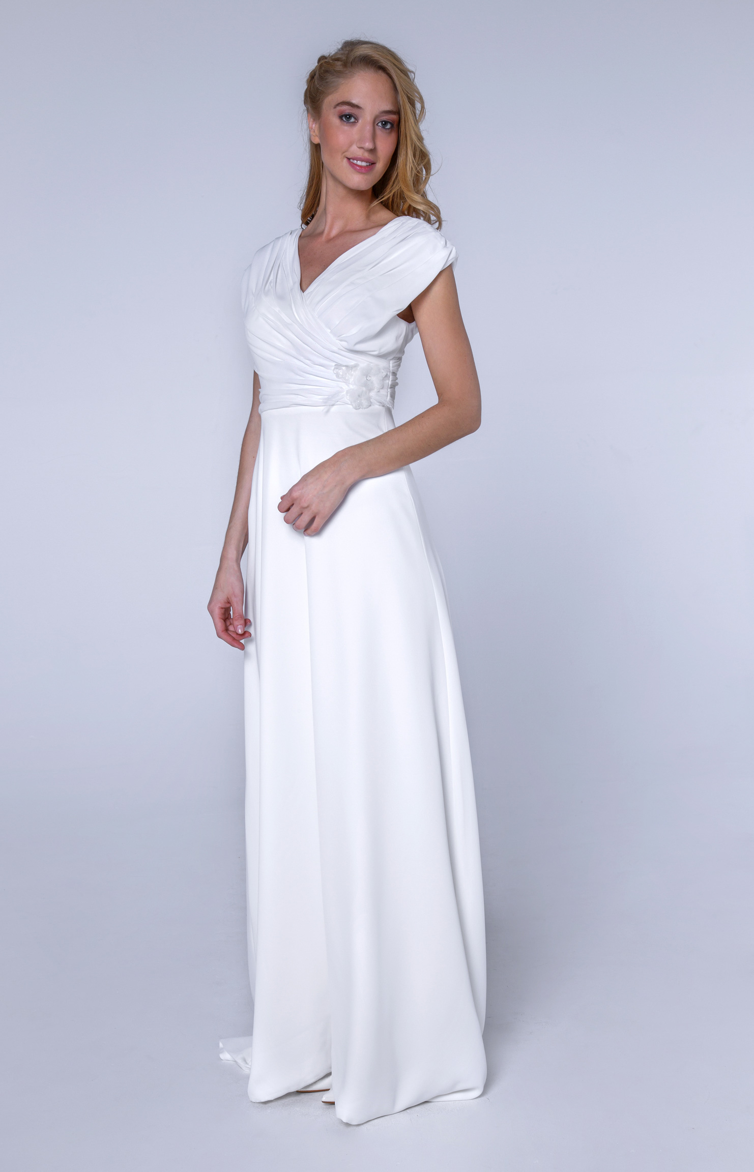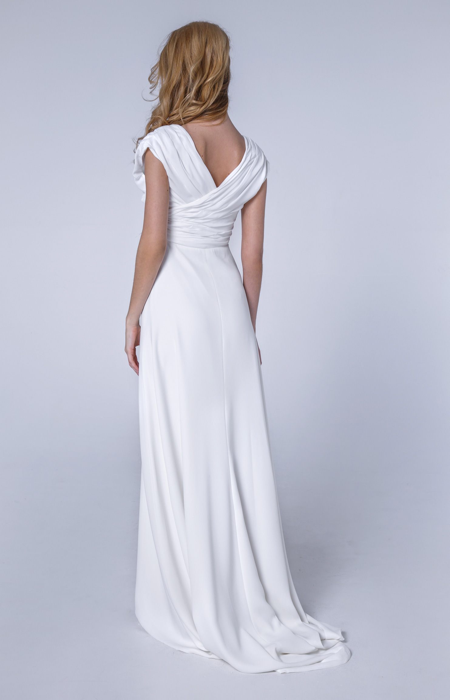 Robe en crêpe fin drapé croisé sous la poitrine et jupe au tombé lourd.