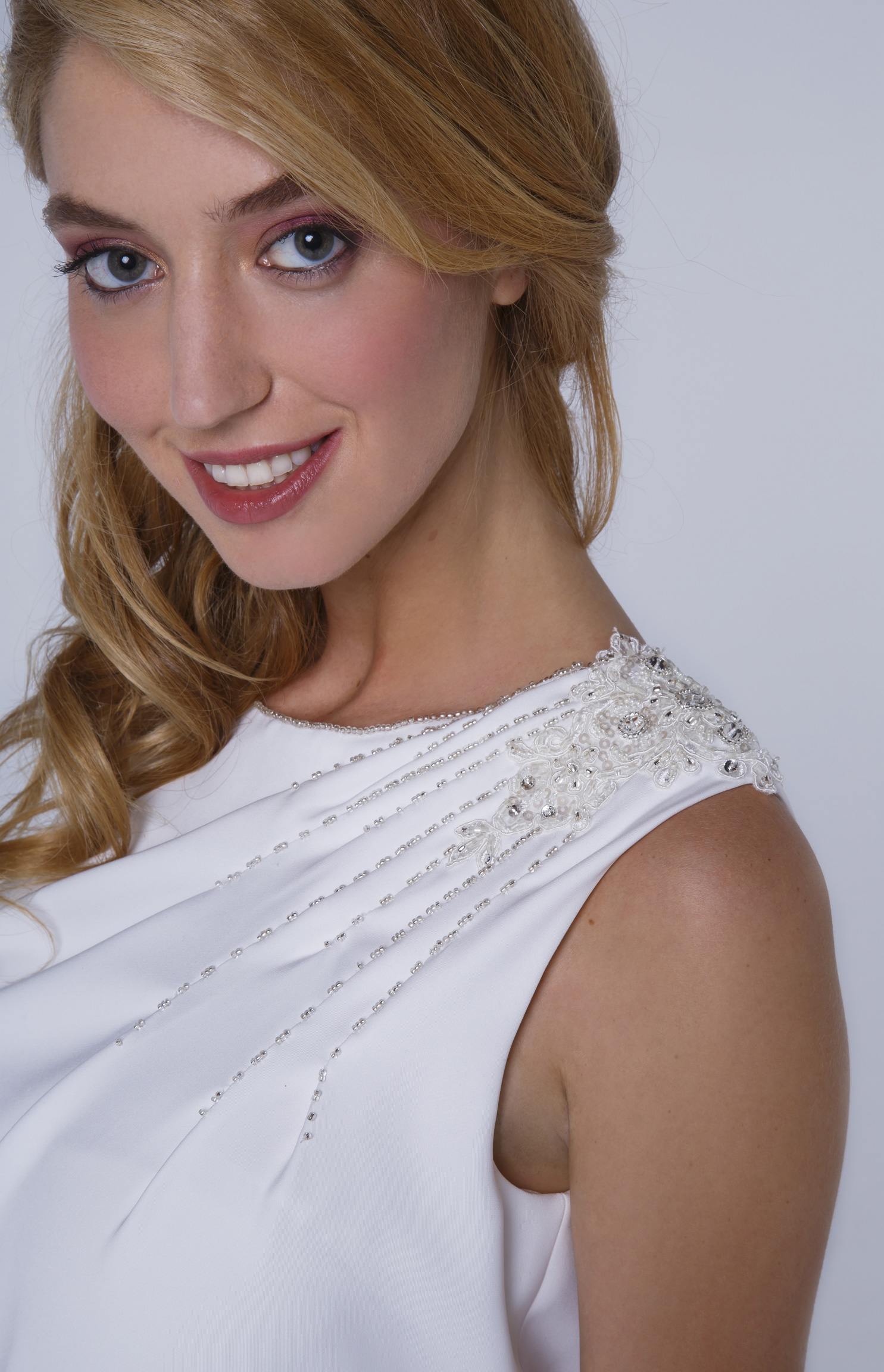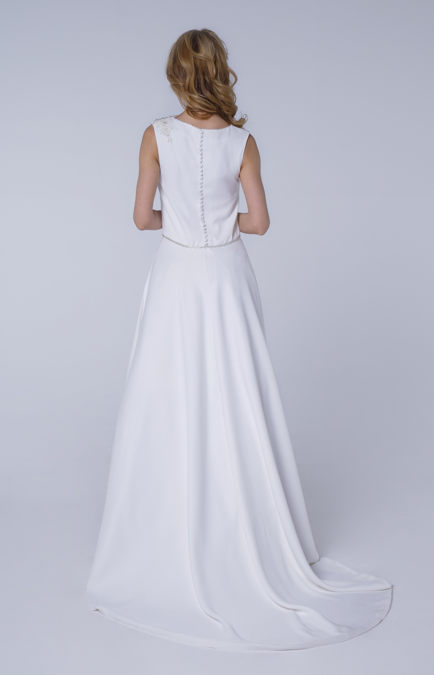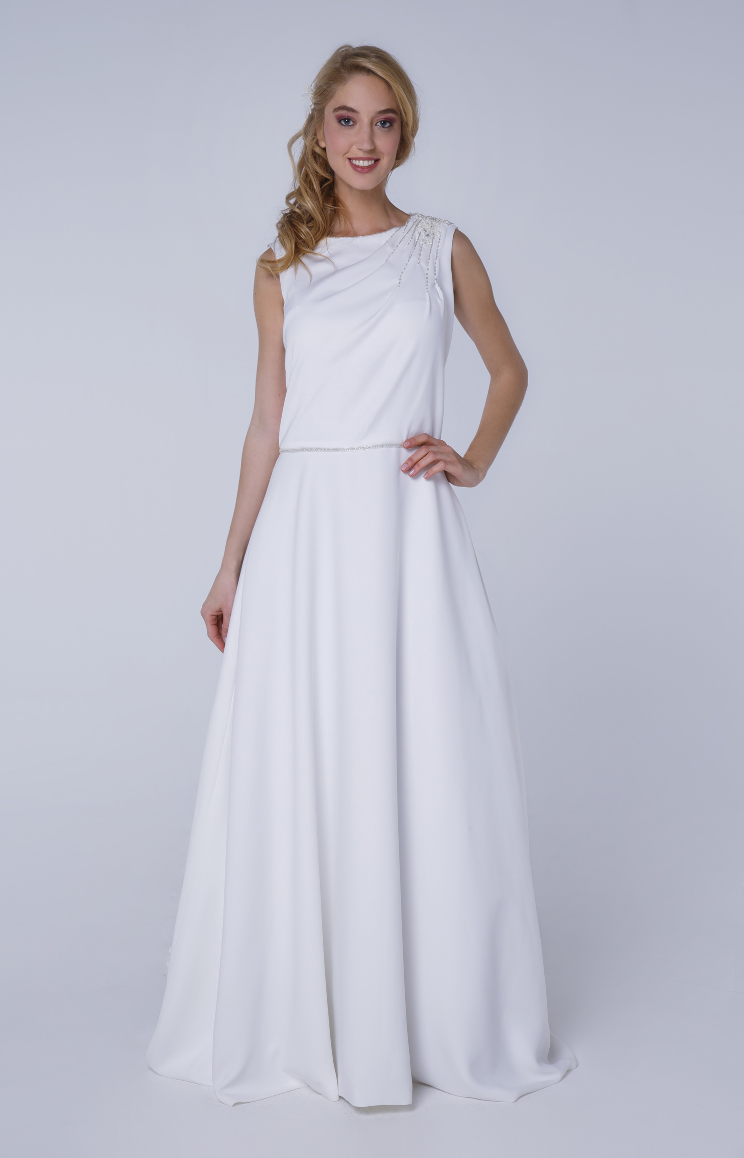 Robe de mariée taille basse en crêpe fluide. Drapé discret à l’épaule gauche orné d’une application brodée.