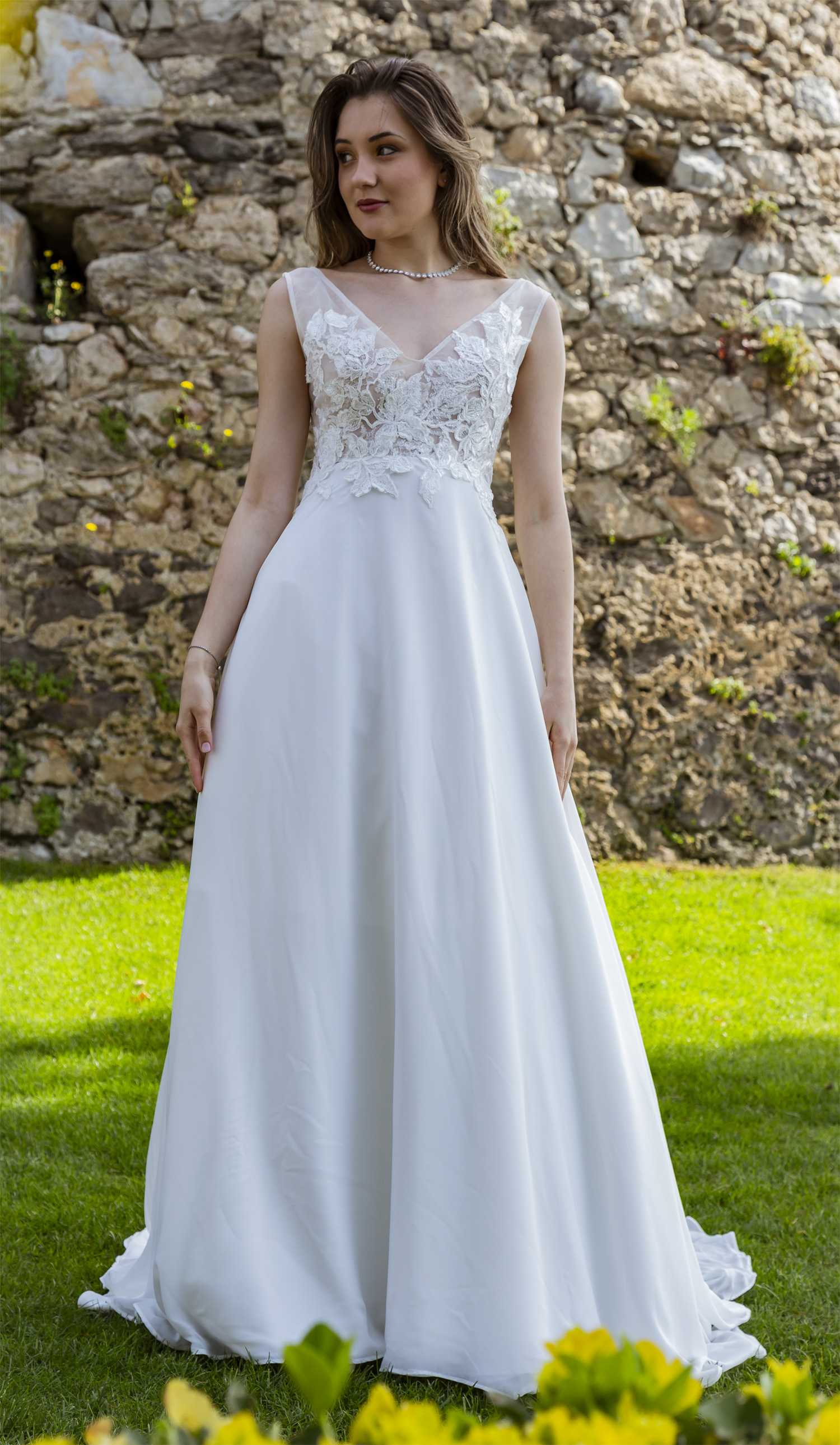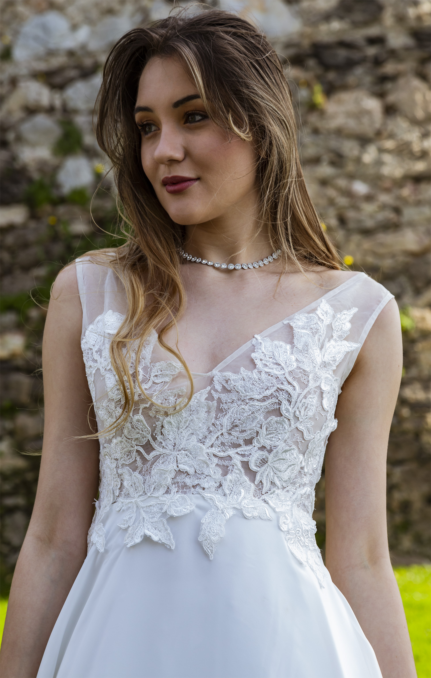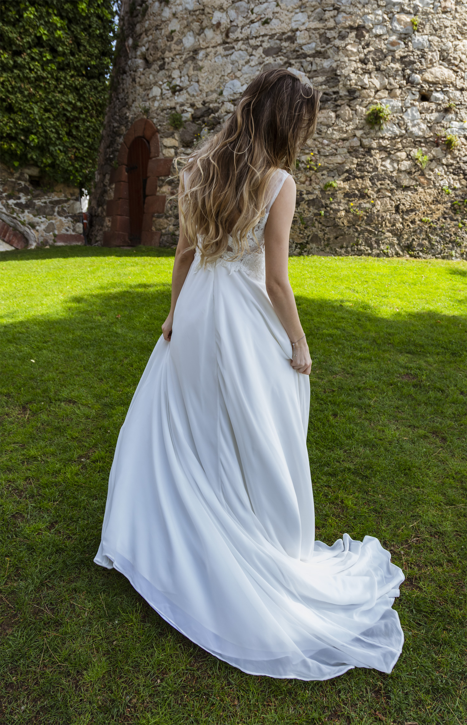 Cette robe en mousseline très fluide donne un mouvement léger à la jupe. Jeu de transparence pour le haut avec un double macramé appliqué à la main sur une base d'organza. Un travail de haute-couture.