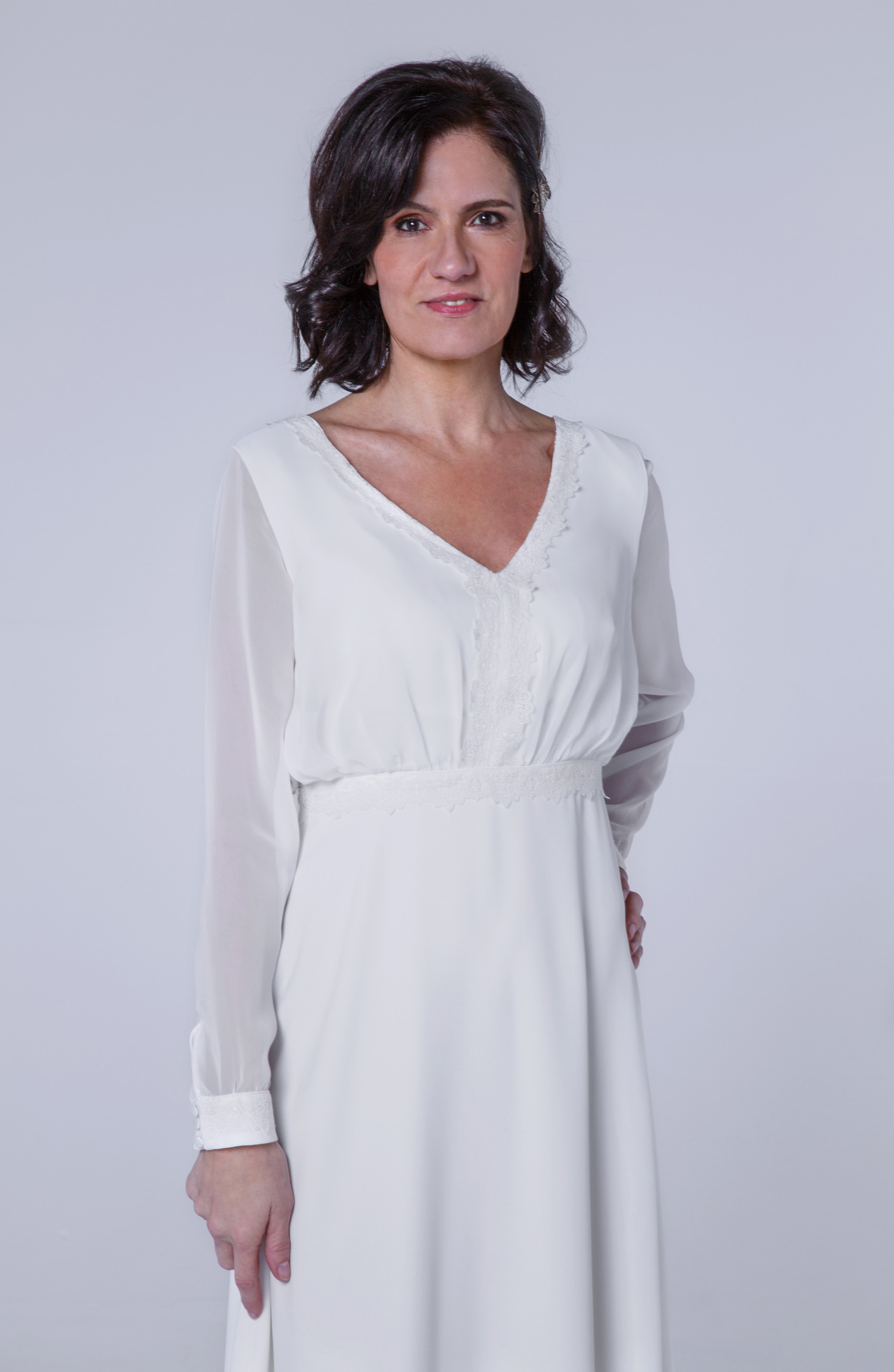Robe de mariée à manches longues, idéal pour un mariage mi saison ou hiver. Décolleté et taille rehaussés d’une fine broderie. Simple mais raffinée
