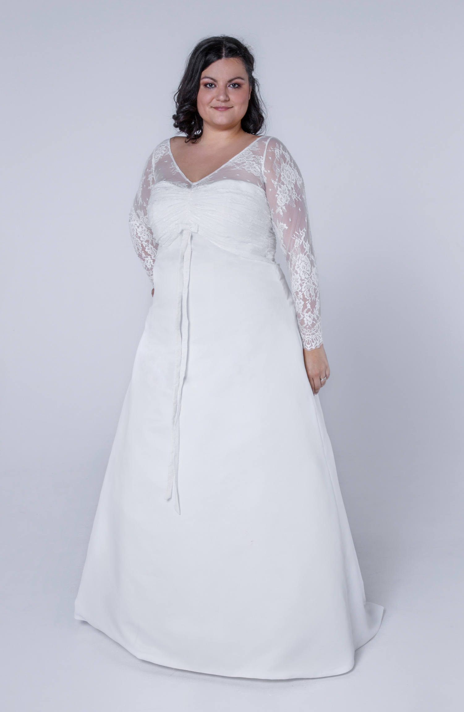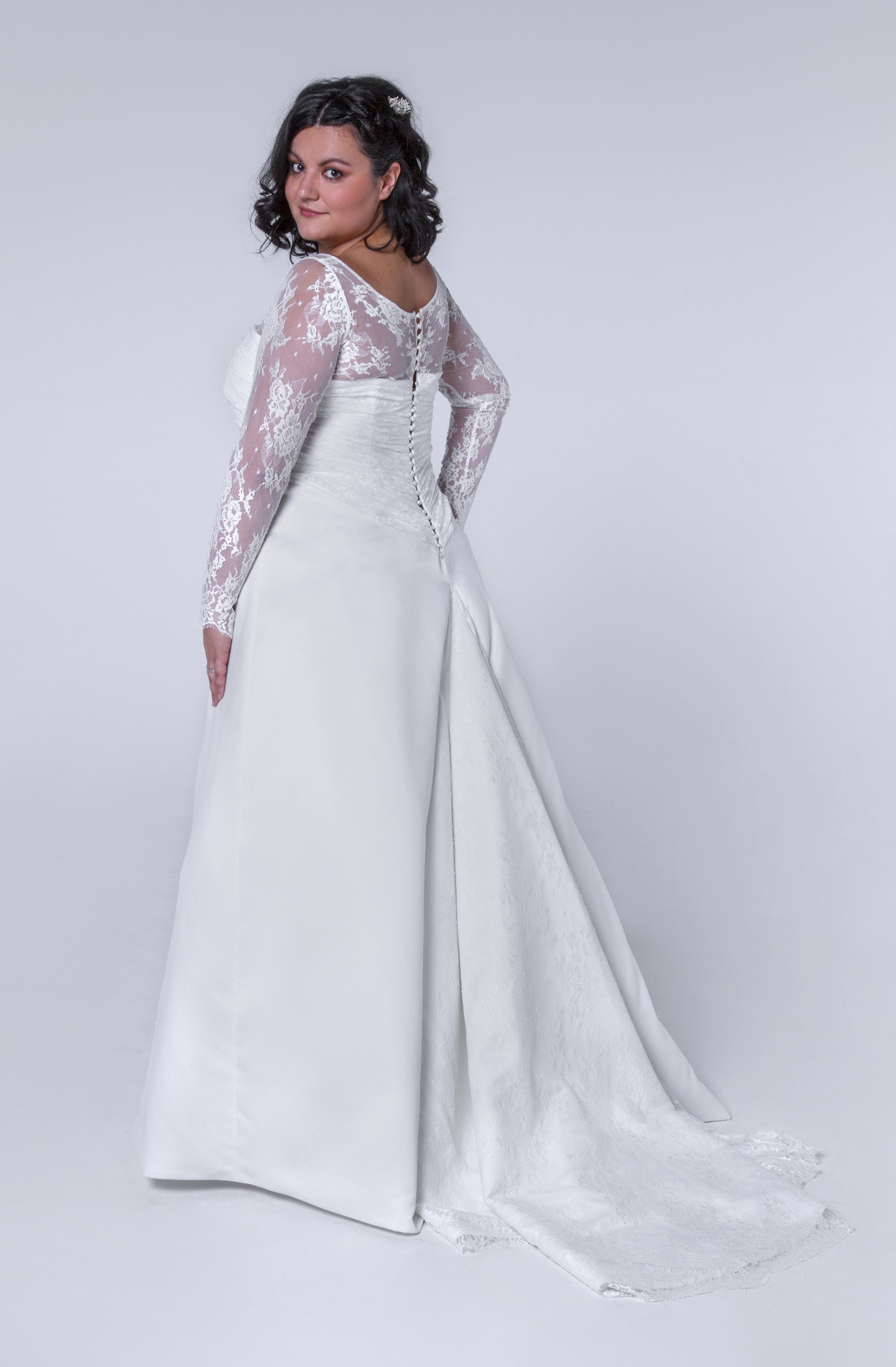 Un petit air de princesse pour cette robe de mariée en satin et dentelle raffinée drapée sur le bustier devant.