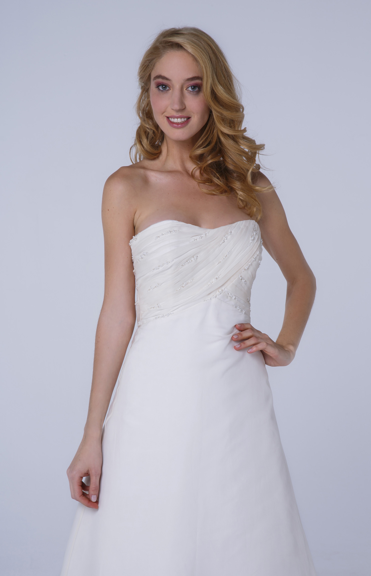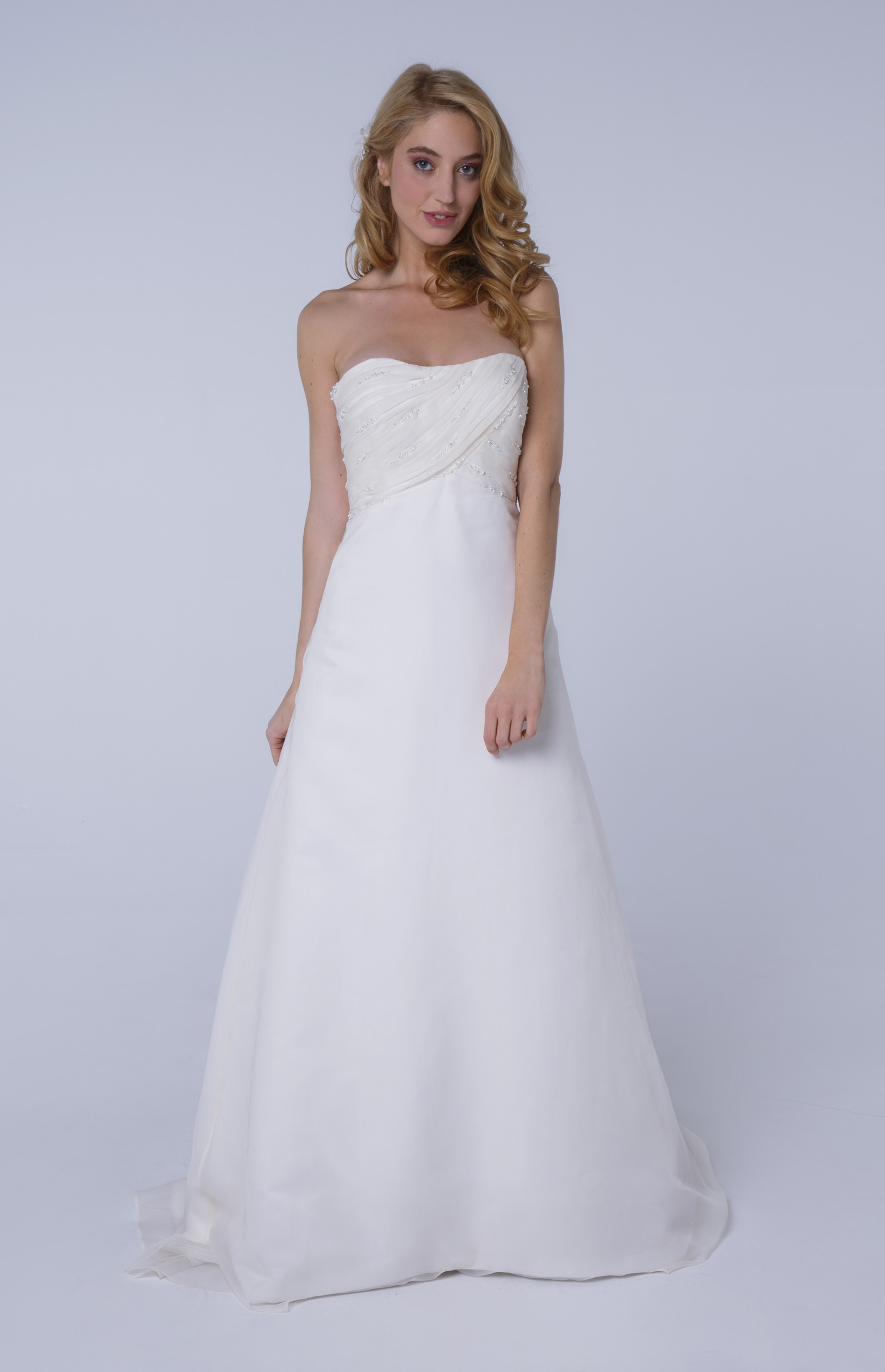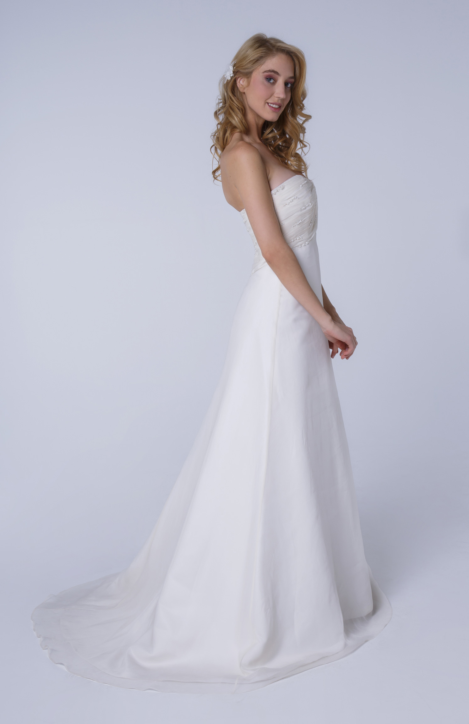 L’organza drapé en biais sur le bustier est orné de petites perles cousues à la main.