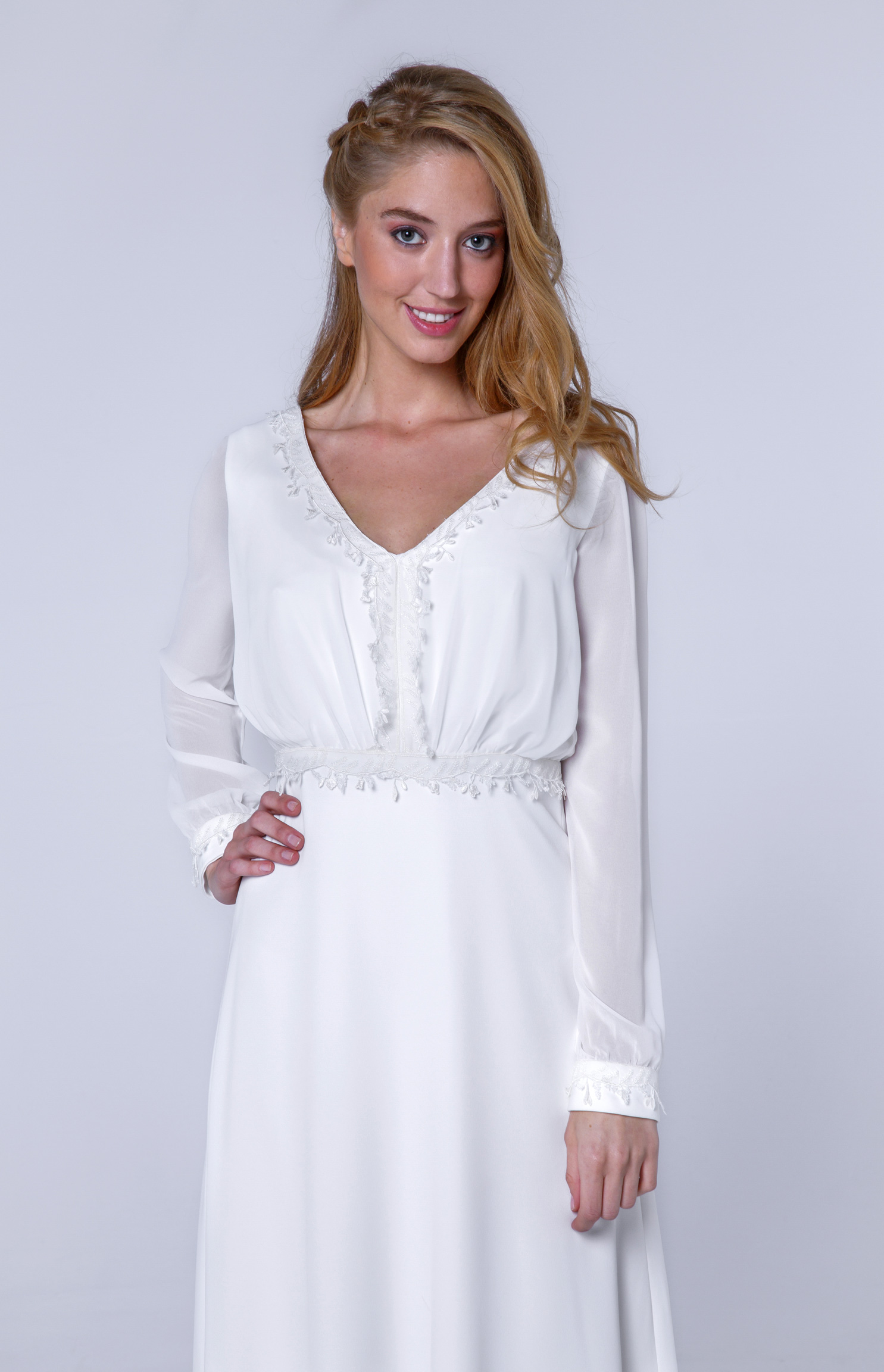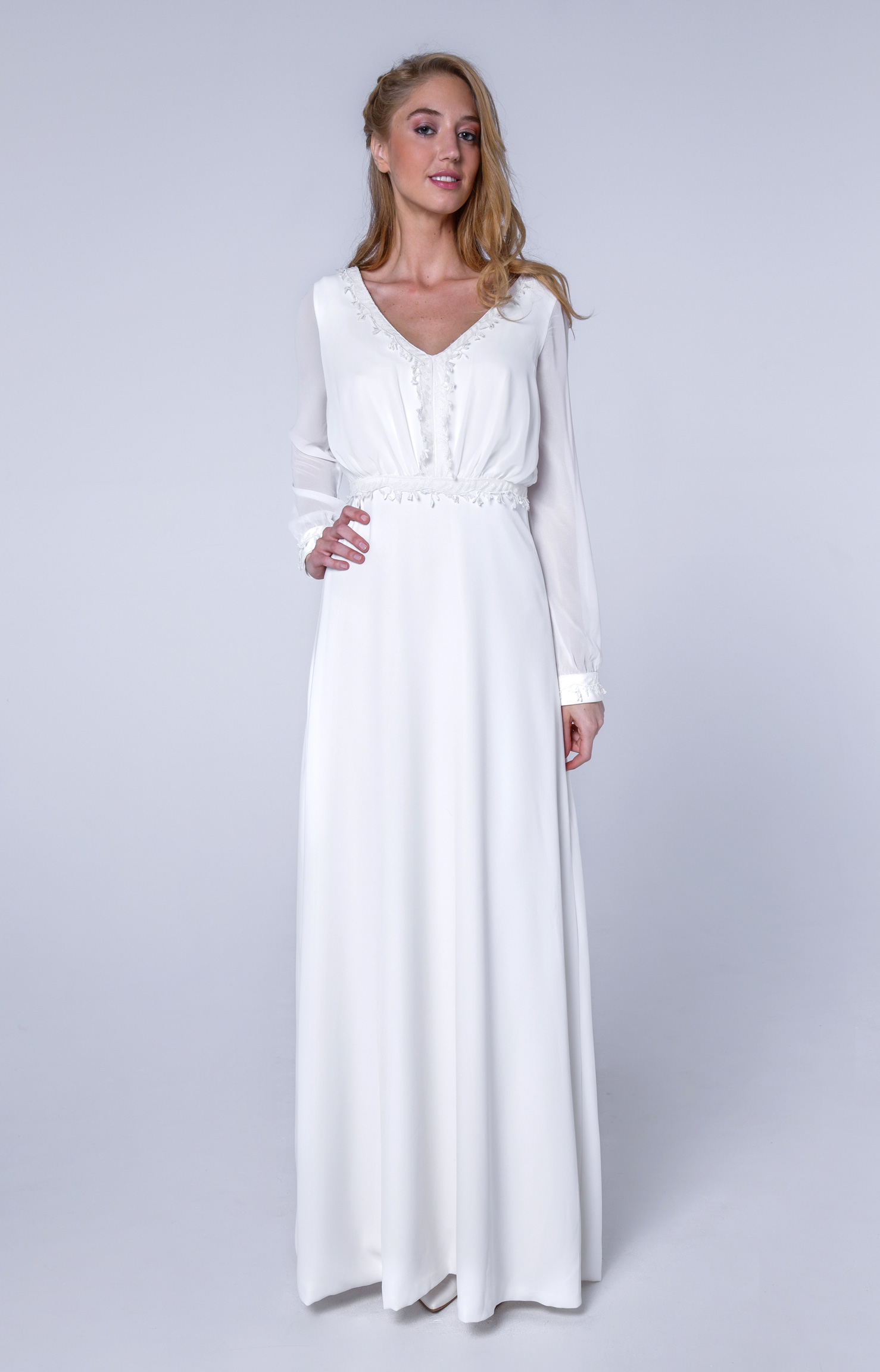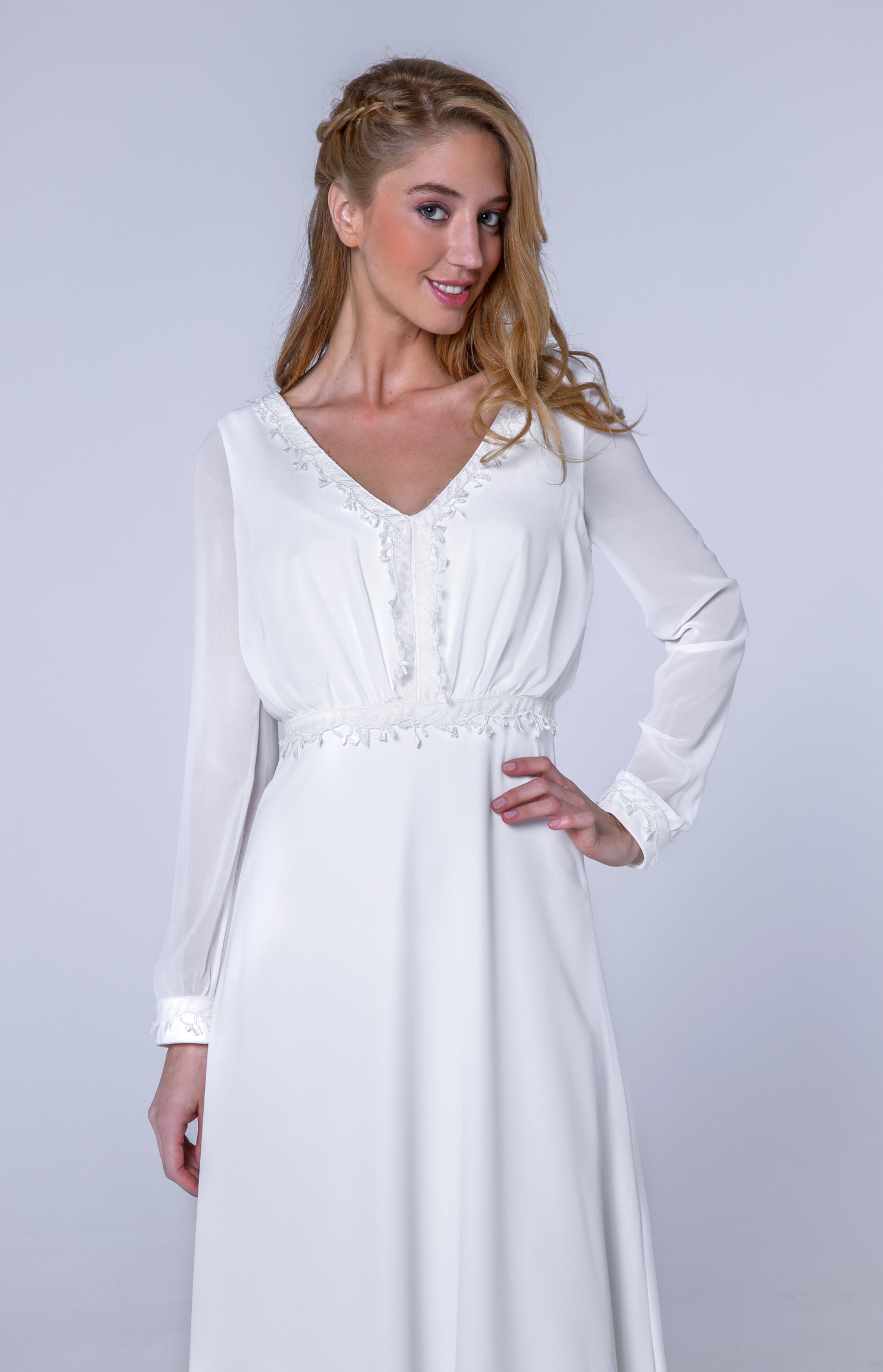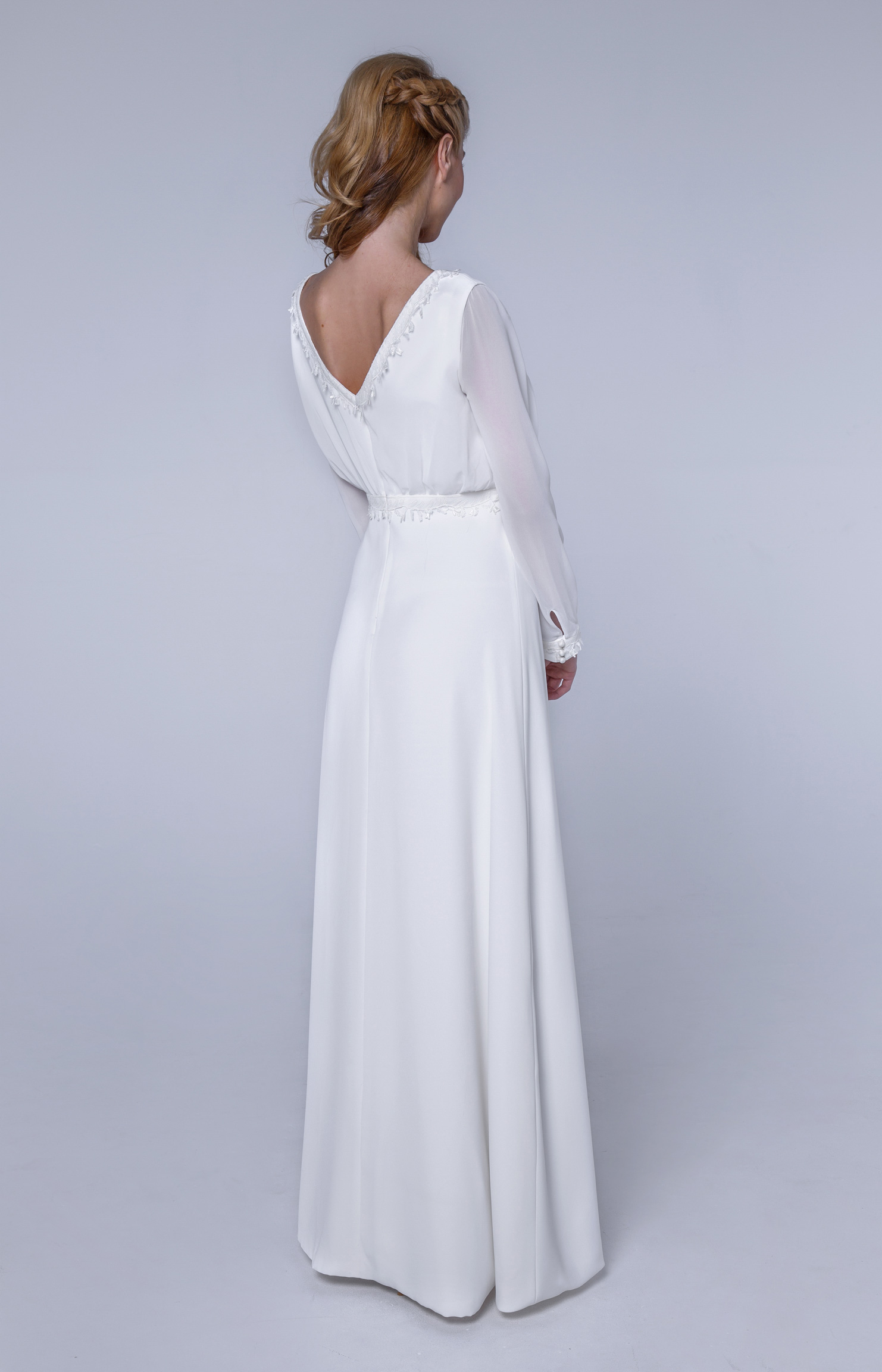 Robe de mariée à manches longues, idéal pour un mariage mi saison ou hiver. Décolleté et taille rehaussés d’une fine broderie. Simple mais raffinée